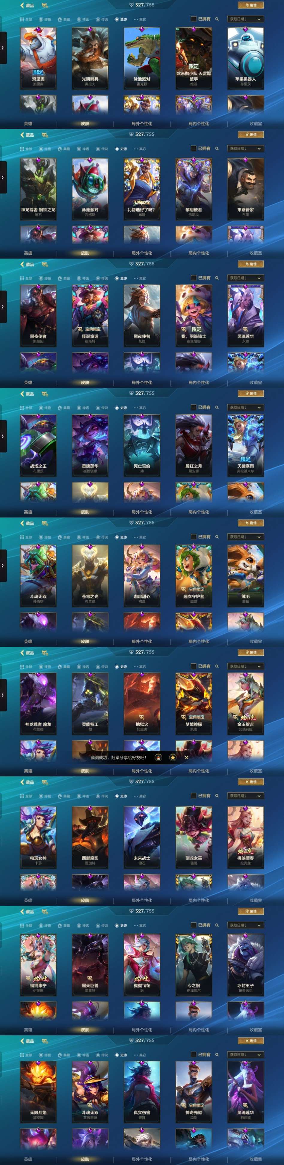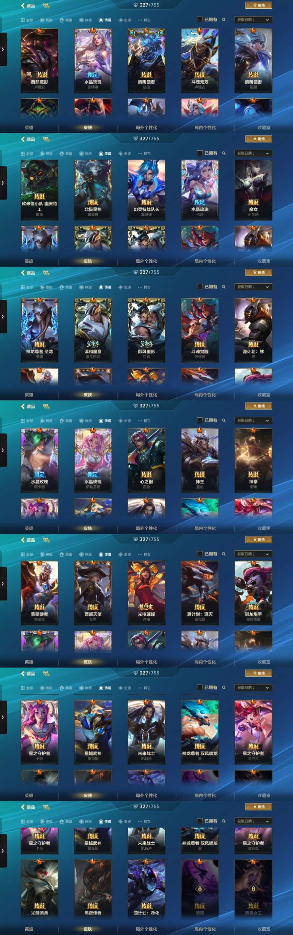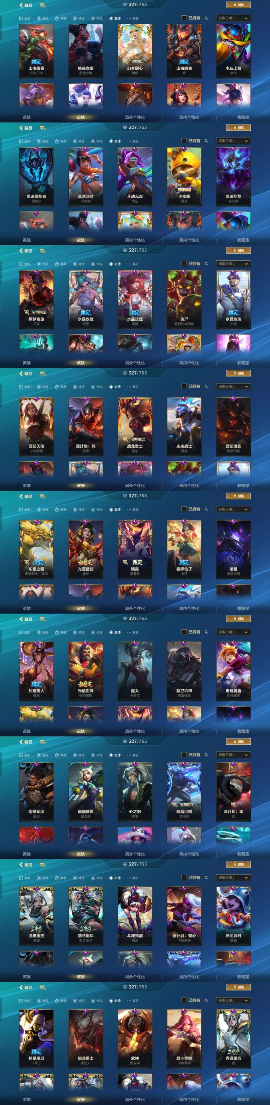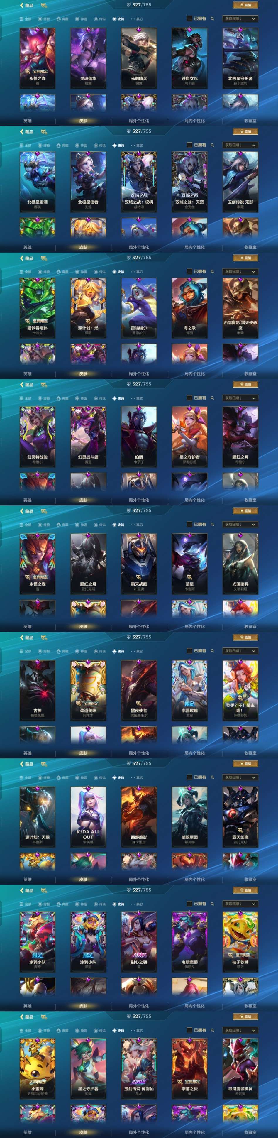 全英雄,327皮肤,4神话:金克丝夜星流火、KBG剑姬、佛耶戈、乘龙破渊李青。1至臻:永恩心之钢