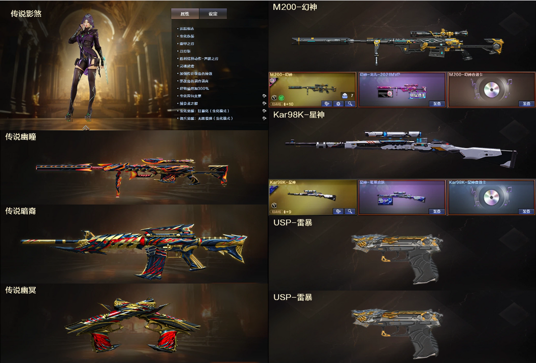 传说幽瞳幽冥暗裔4防影煞♉幻神宠儿音效+白虎星神三件套♉QBZ裁决+2USP雷暴♉炽芒小刚蝴蝶6烈龙