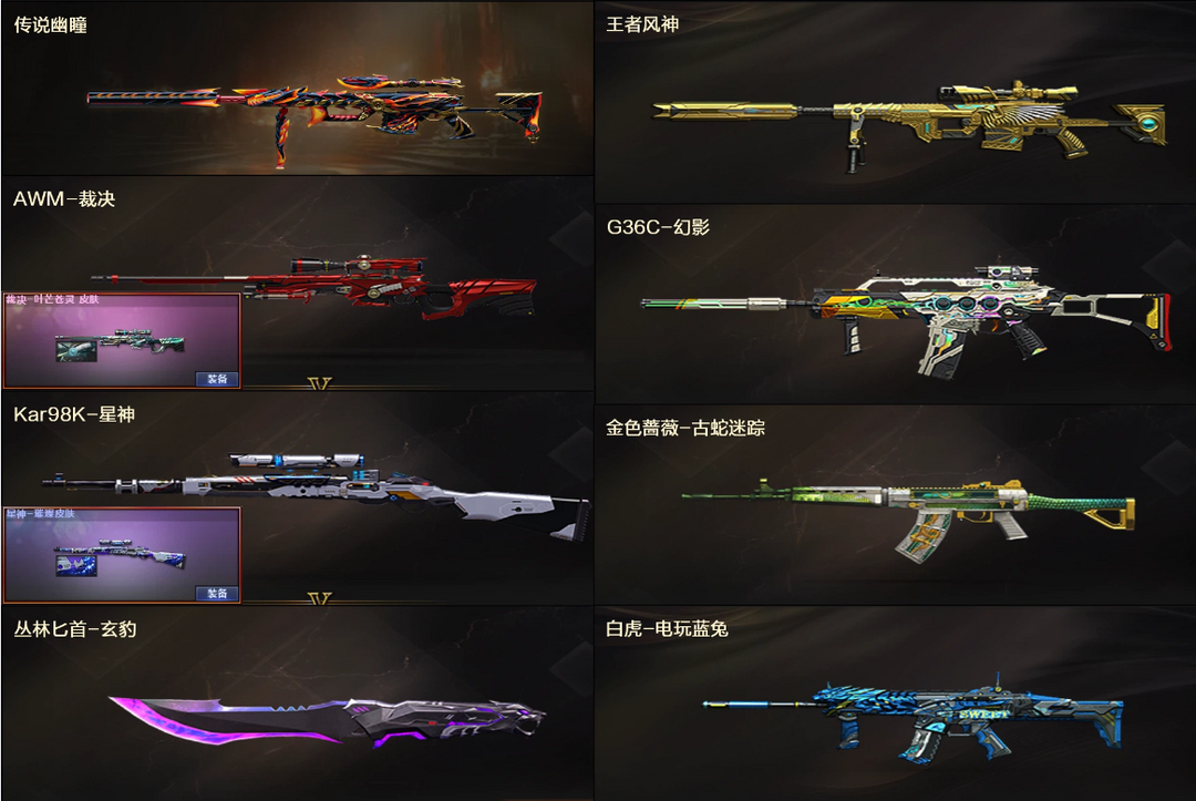 传说幽瞳♉星神璀璨+裁决苍灵♉王者风神+G36C幻影金色蔷薇白虎蓝兔♉雷神毁灭修罗屠龙匕首♉3防猎狐