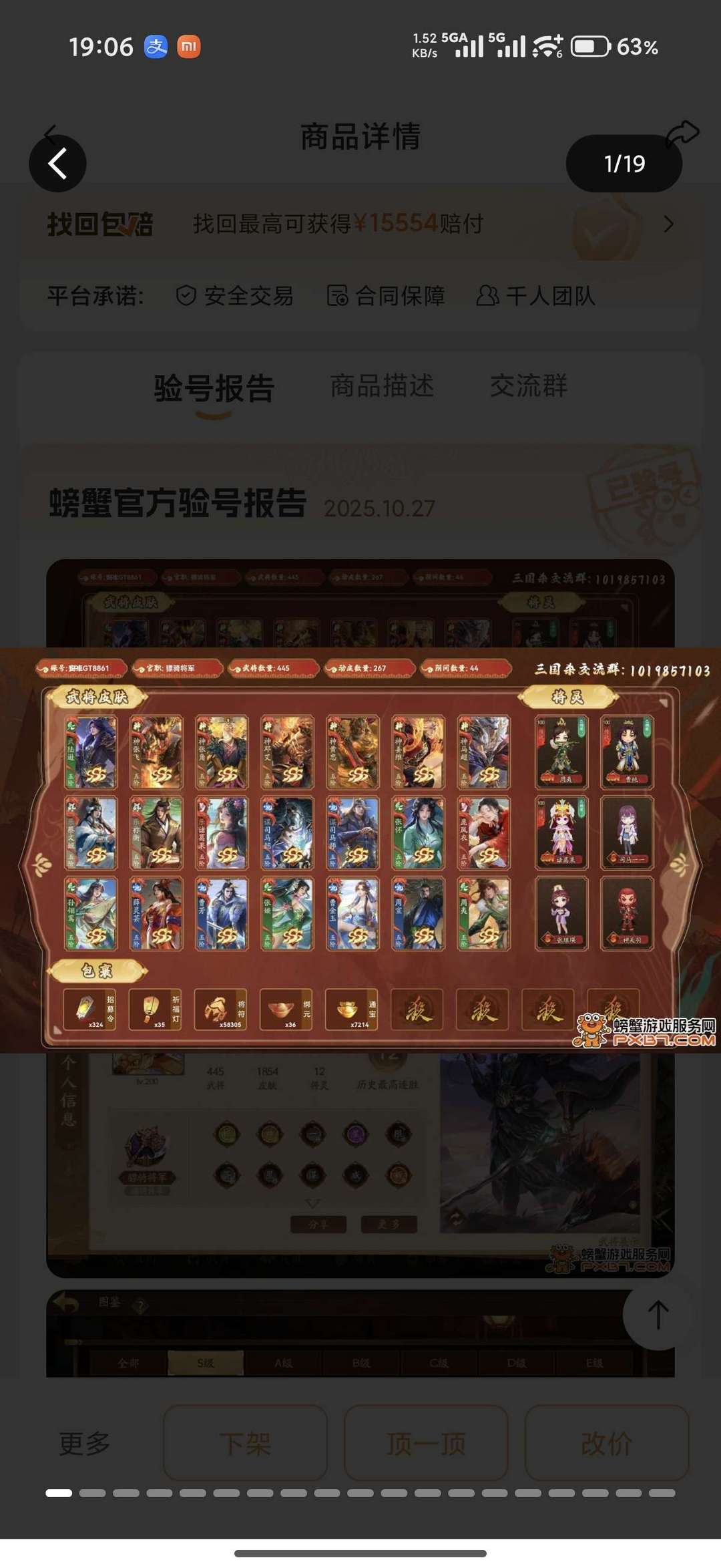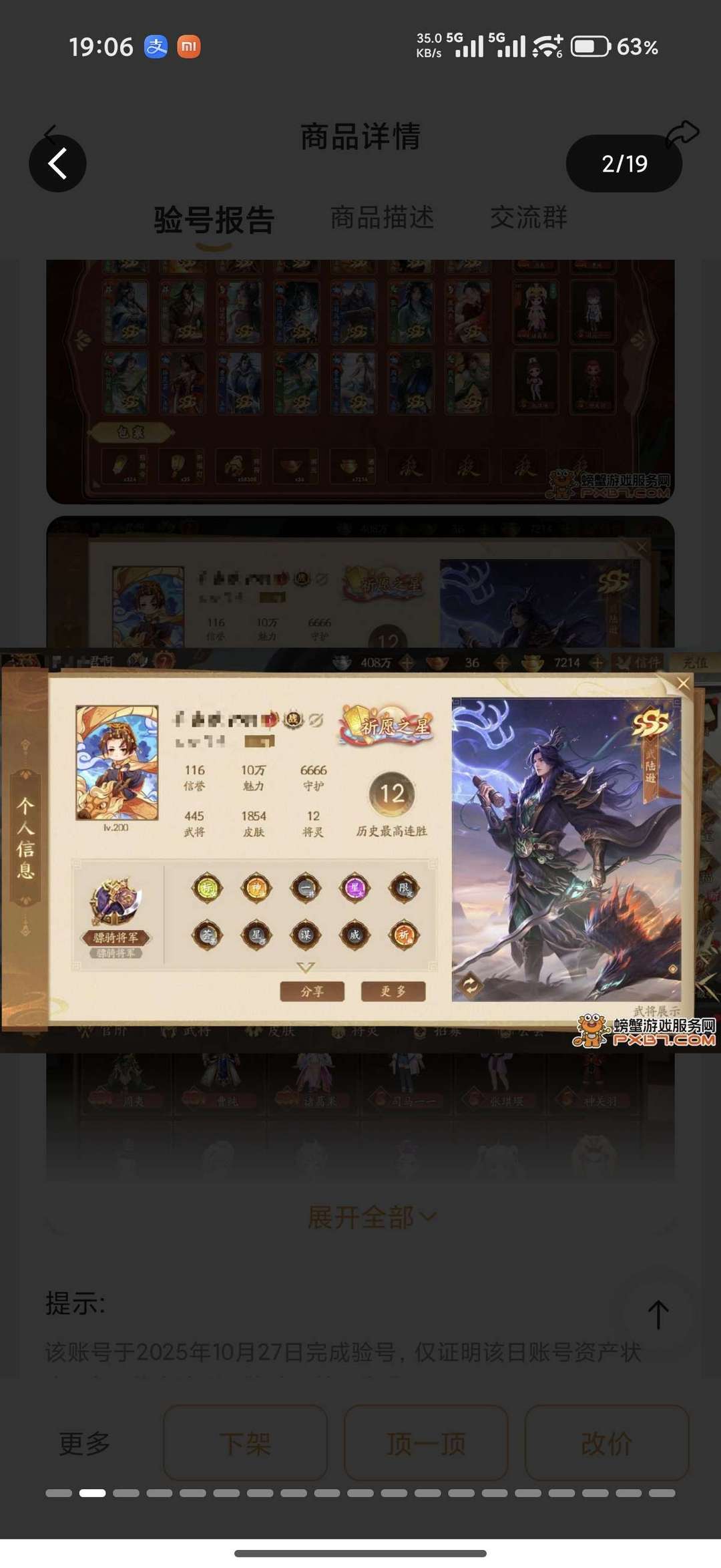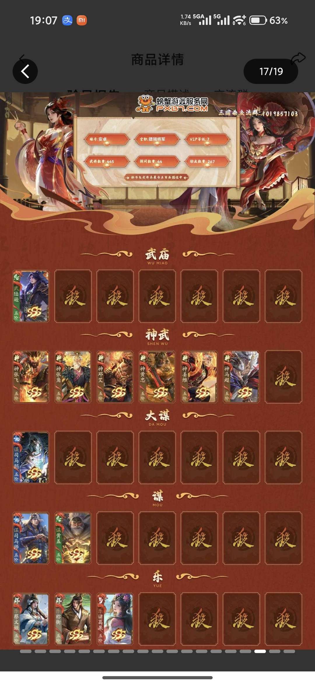 限制: 撤单率<50%才可租用此帐号装备描述:【445骠骑将军】 1武庙,6神武,1大谋,3乐,2星河,7祈福,多限定皮肤,乐游积分8.7万,V7,官服个性号,武陆逊,神黄忠、神张飞、神张角、神马超、神邓艾、神姜维、谋司马懿、谋司马师、乐蔡文姬、乐祢衡、乐诸葛果,周宣,曹芳,钟毓等,多SSA将灵(曹纯,诸葛果,周姨),大小月卡已拉满,将符商店全部清空,鲍三娘、曹婴、徐荣,赵襄、张琪英、关索、曹纯等祈福武将全齐,其他的看图。