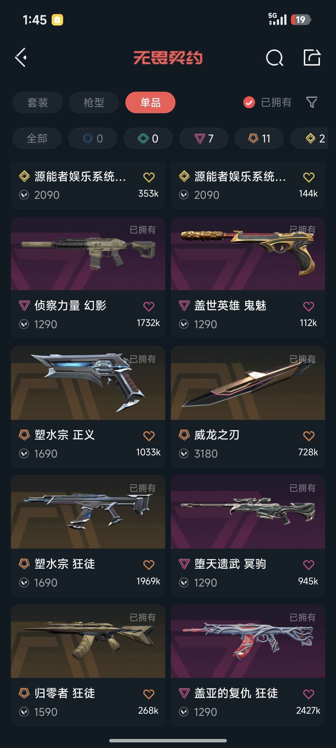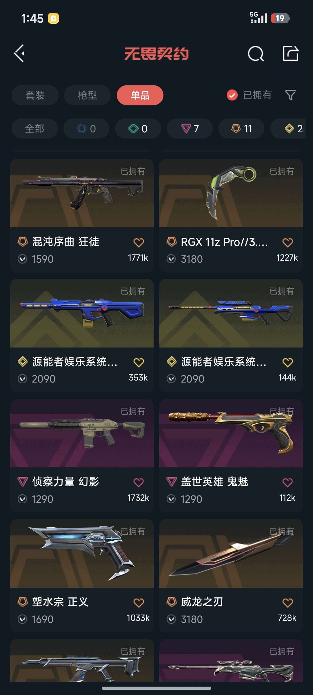 装备描述:ak:盖亚,混沌,掠夺,25冠军,紫金,塑水宗,归零者,显卡 幻影:侦查,电玩 刀皮:威龙,显卡爪,黑市蝴蝶 正义:奇点,塑水宗 大狙:电玩,堕天 鬼魅:猴子 戍卫:紫金
