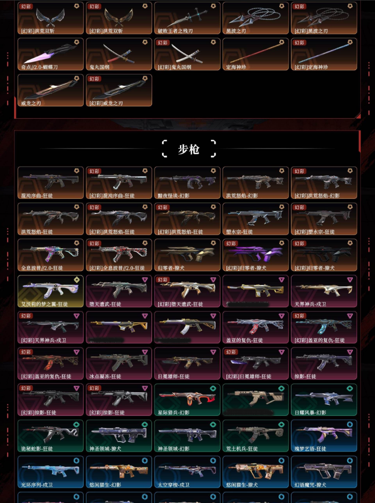 装备描述:2025冠军朋克3.0超时空卫队2022冠军双城之战末日泡泡滋滋特攻队光荣异象虚空遗器噬影者显卡离子武器2.0苍龙之刃vct爪刀影钩显卡2.0蝴蝶刀洪荒双战奇点2.0蝴蝶刀威龙之刃混沌序曲狂徒黯夜怪谈幻影洪荒怒焰幻影洪荒怒焰狂徒塑水宗狂徒全息波普2.0狂徒归零者撩犬艾莉沃的梦之翼狂徒堕天遗武狂徒紫阙金琅2.0幻影紫阙金琅狂徒盖亚的复仇狂徒冰点凝结狂徒日冕雄狮狂徒掠影狂徒显卡2.0冥驹塑水宗飞将显卡3.0莽侠堕天遗武冥驹奇幻朋克2.0冥驹起源冥驹西部未来奥丁奇点战神艾莉沃的梦之翼奥丁显卡2.0骇灵天界神兵蜂刺紫阙金琅骇灵上古龙岩判官双城之战正义显卡2.0标配西部未来正义黯夜怪谈标配洪荒怒焰短炮塑水宗正义奇点正义天界神兵鬼魅紫阙金琅标配海洋之星短炮