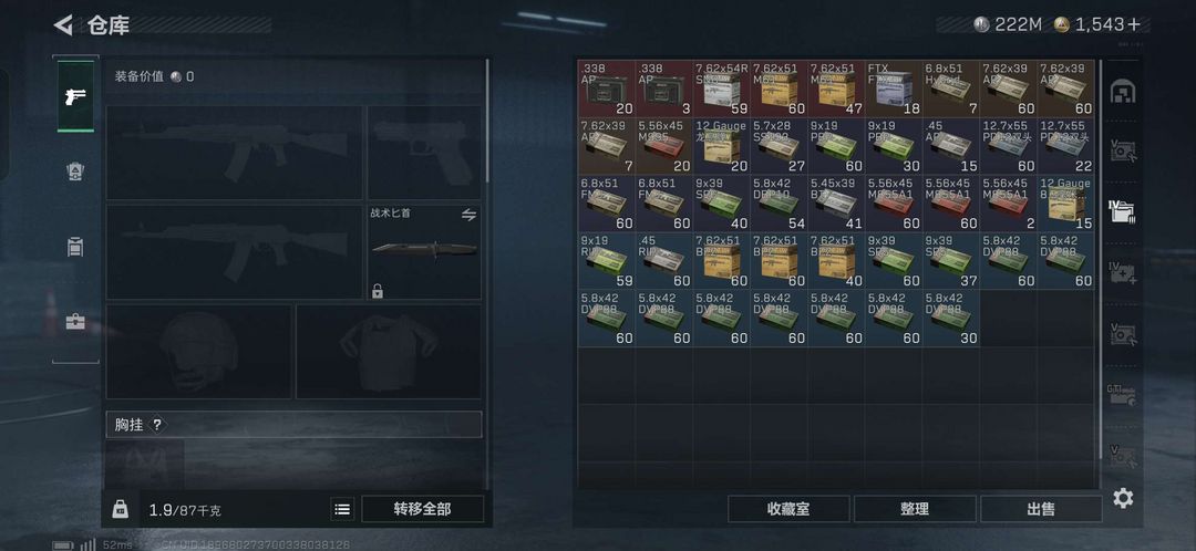 装备描述:222m纯币带23发aw子弹 103发762红蛋 无刀片红皮