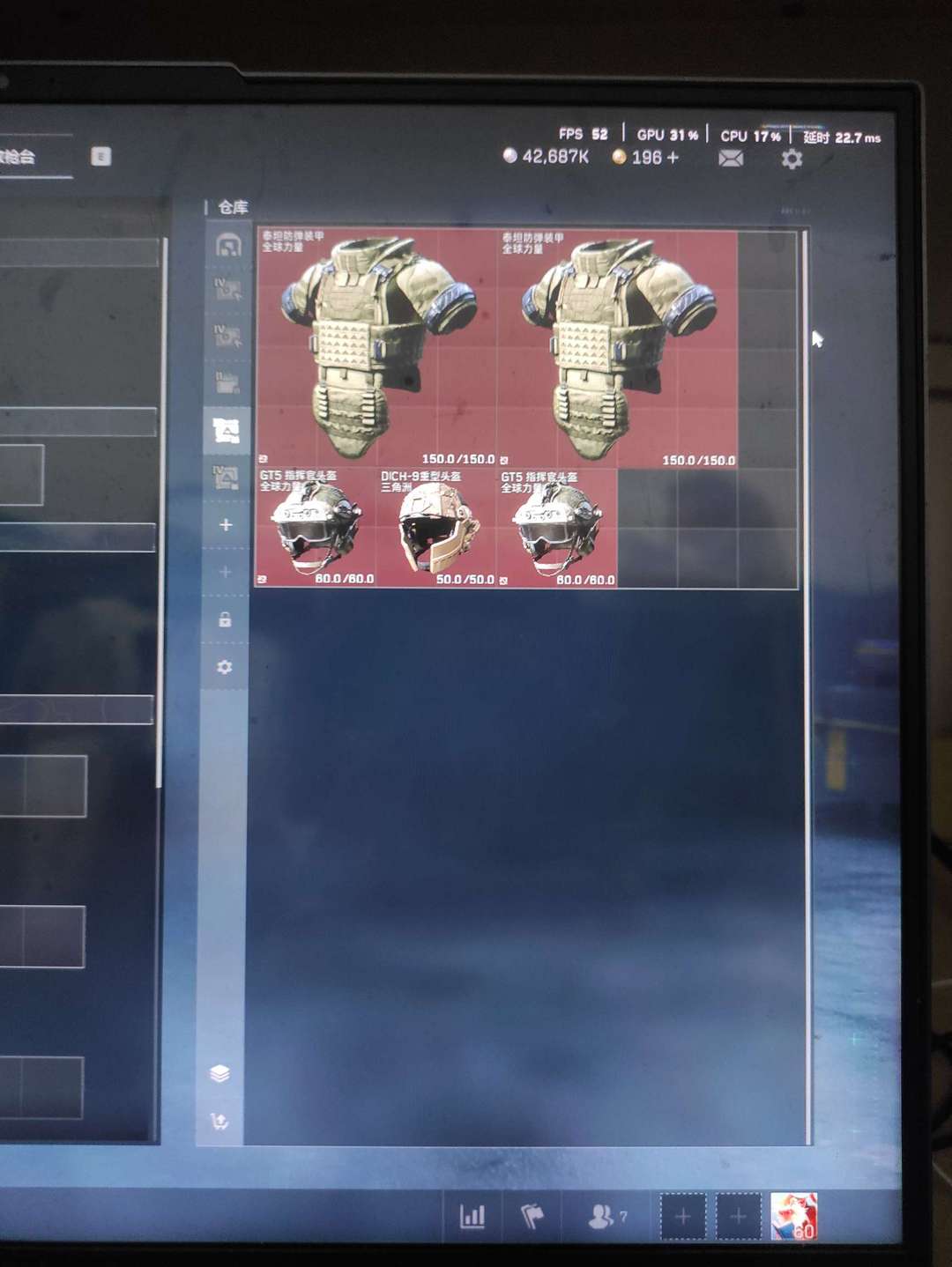 装备描述:现金42687k赛季3x3,训练,指挥中心满级,俩金皮,一红皮,红狼,无名,麦晓雯