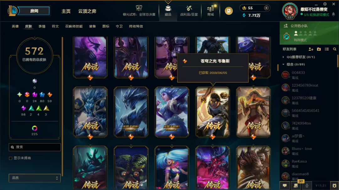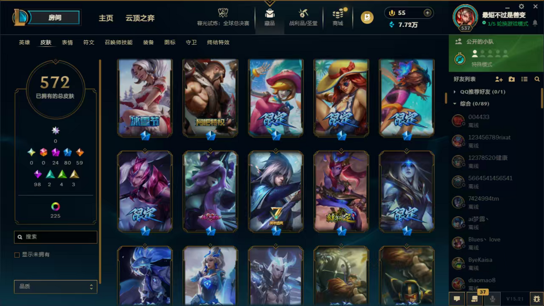 装备描述:英雄联盟/联盟三区/钢铁烈阳/572皮肤/全英雄 请不要挂机 谢谢