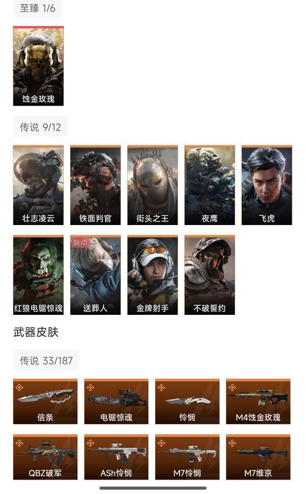 装备描述:10干员3刀,蚀金玫瑰吴彦祖,怜悯,电锯惊魂,信条,33款传说枪皮