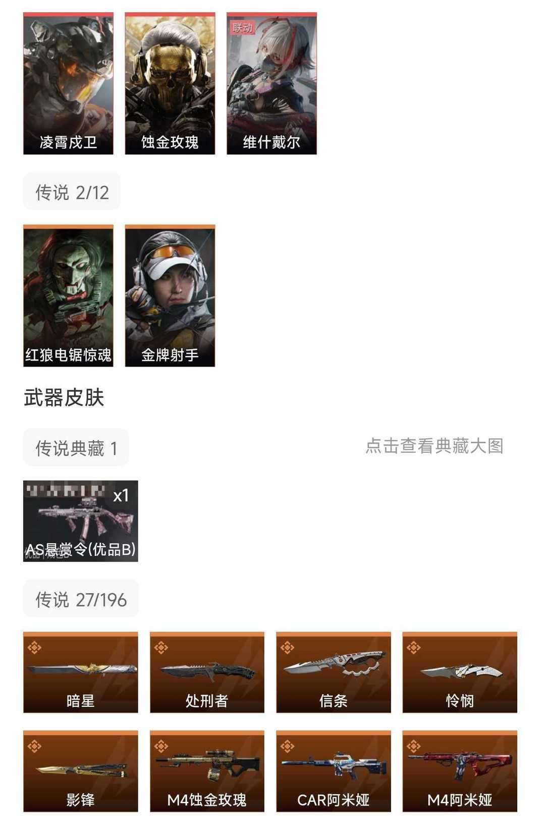 皮肤号 凌霄戍卫6刀,蚀金玫瑰,维什戴尔,怜悯,暗星,蝴蝶刀,信条,典藏枪s8赛季2×3保险箱