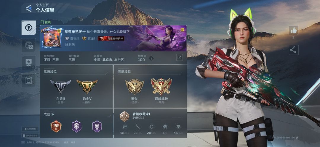 限制: 撤单率<50%才可租用此帐号装备描述:禁止改名!!!禁止乱删好友!!!禁止随便更改社团!!!珍惜账号,枪械币/自选蓝图/NZ点勿动,本账号金额已达金额,如遇封号必定追责。退出游戏3次及以上拉黑处理。