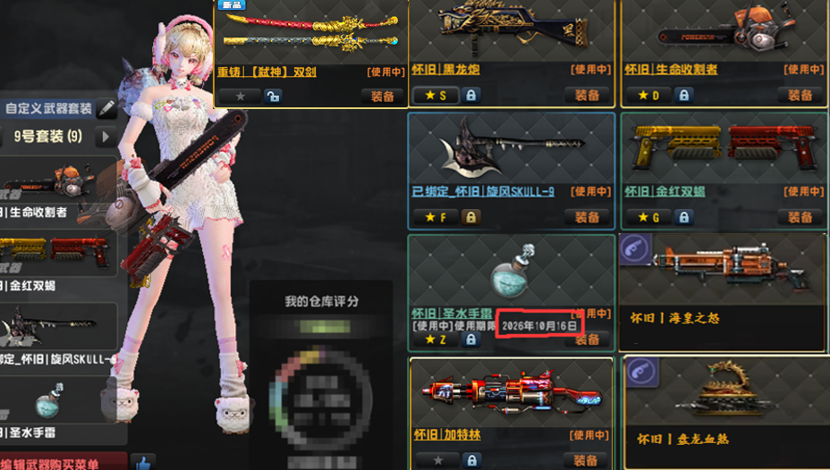 怂●紫钻过期●怀旧弑神●双黯特典加特林特典狙黯火●兔神龙神白洞天使雷●光束套闪电套重铸怀旧套去雾