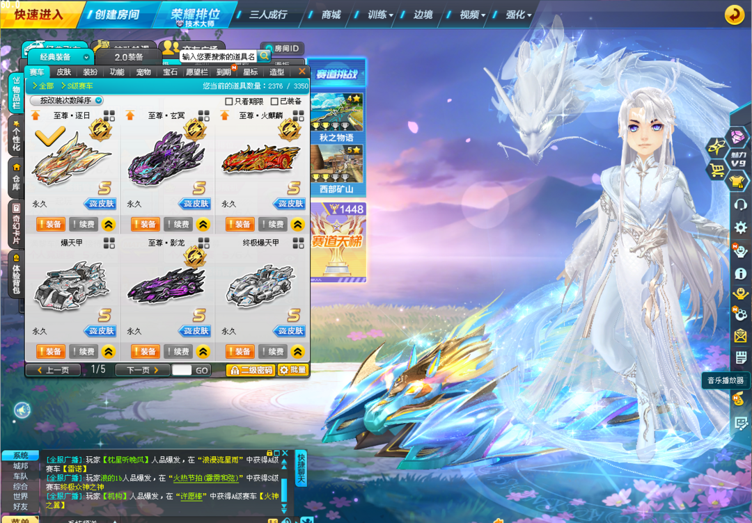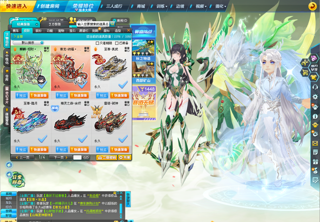 【顶配竞速号】满配至尊-踏月、至尊-真武、X次元玉如意、X次元绘春生、蛇年创世女娲、蓝鲸满级+10