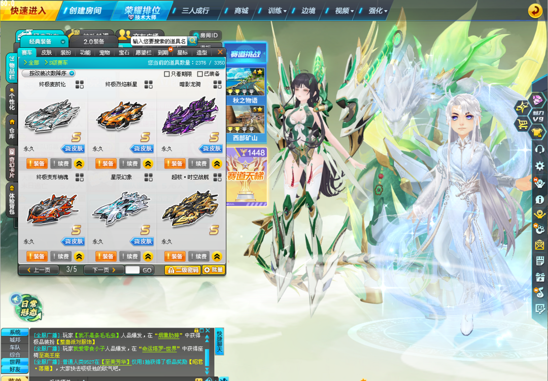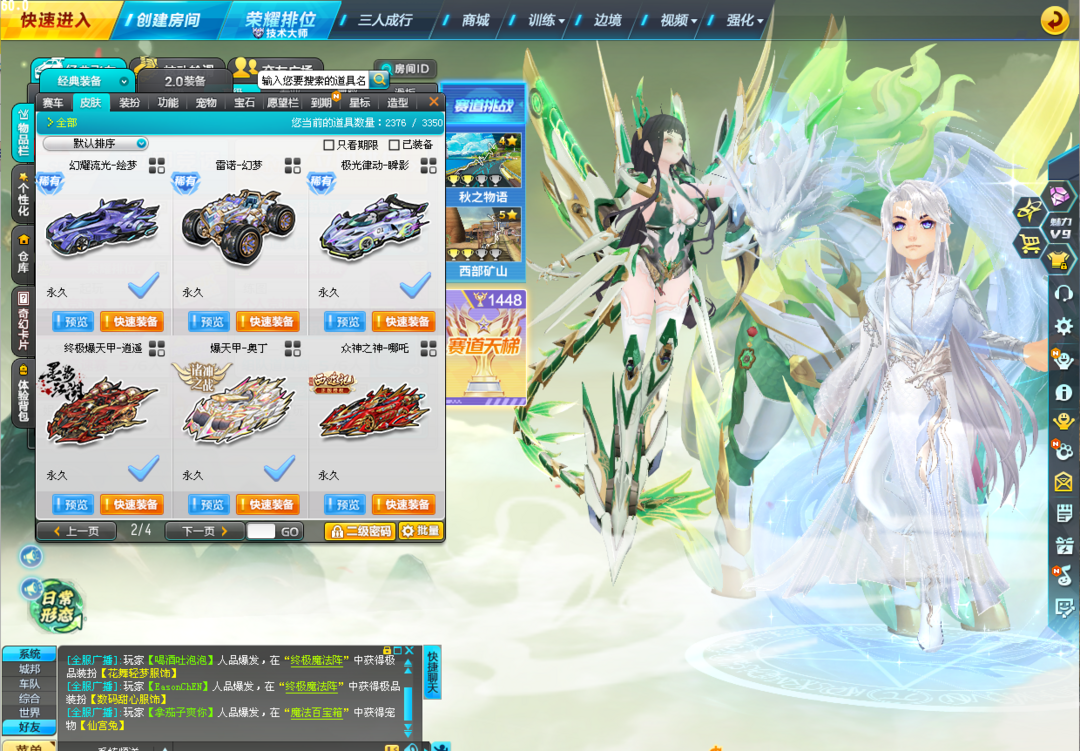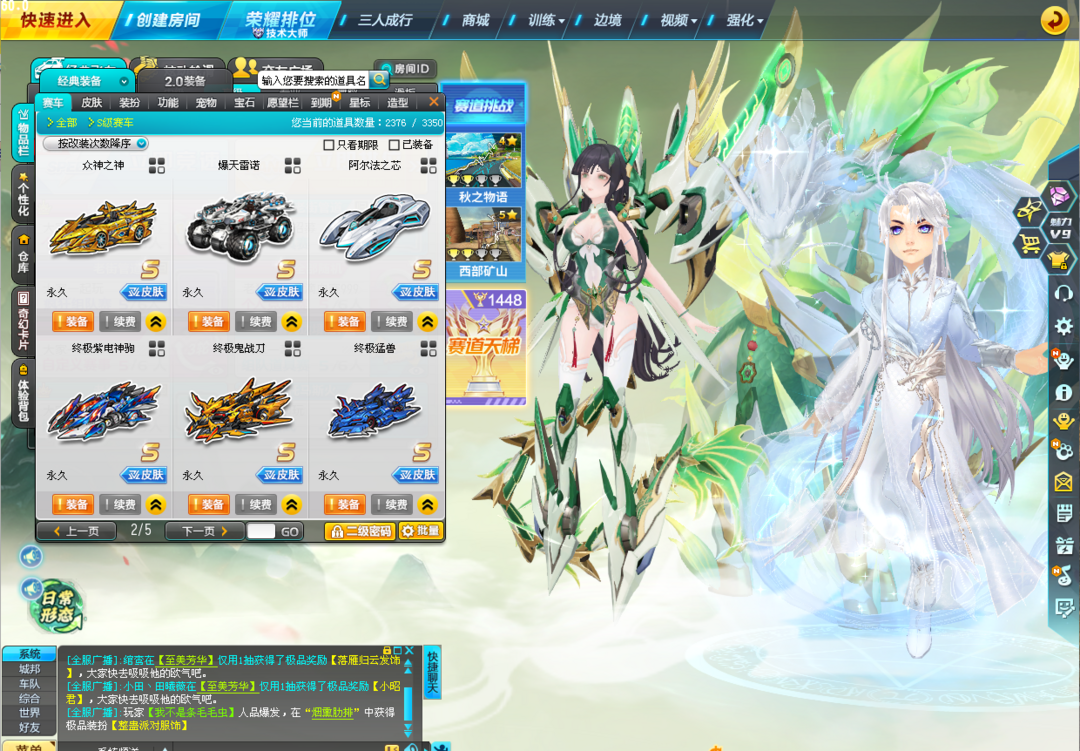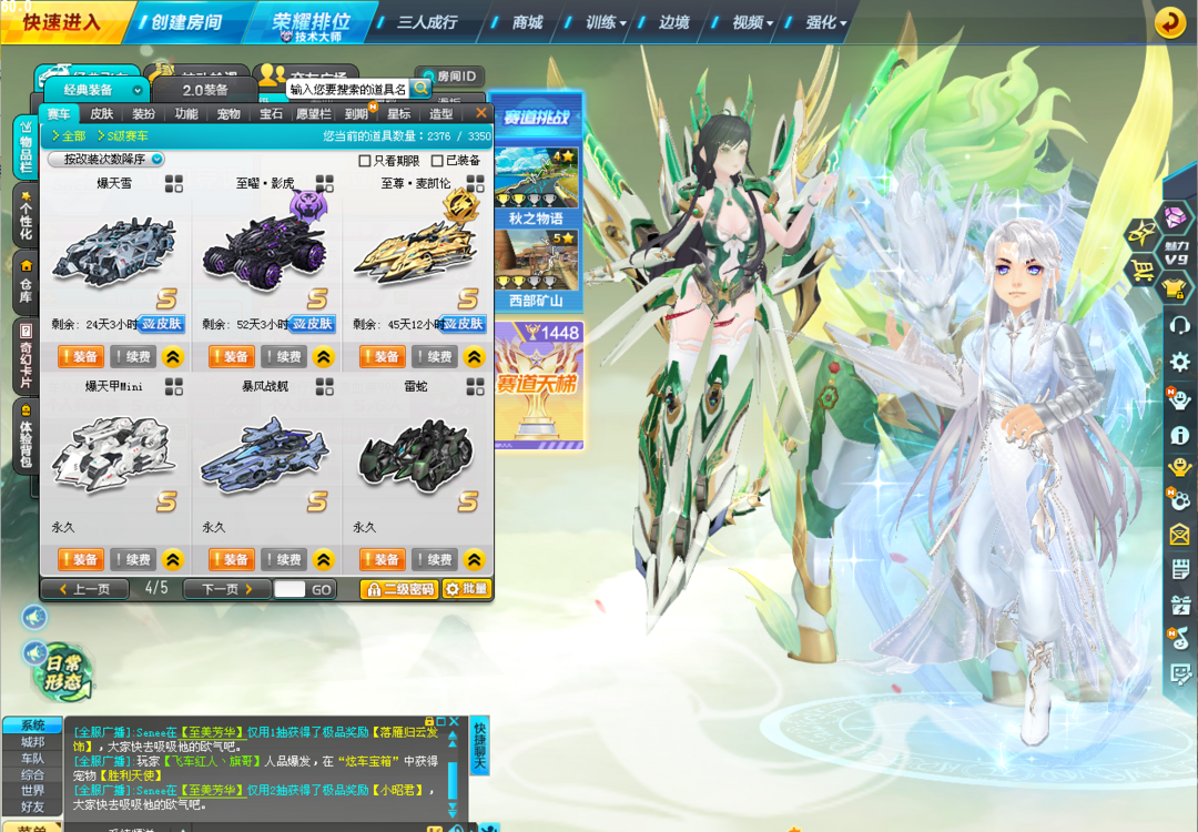 装备描述:刚氪出马年年限、新X次元,上号授权密码已更新 【T3】蛇年创世女娲、创世之神、圣域大天使 【S】蓝鲸强化+10、满配马年至尊-踏月、蛇年至尊-真武、X次元-玉如意、X次元-青龙绘春生、爆天雷诺、超核时空战舰、终极爆天甲-逍遥、爆天甲-奥丁、阿尔法之芯、众神之神-麒麟+哪吒、终极银天使、终极紫电神驹、终极鬼战刀、终极烈焰新星、烈焰新星、终极迈凯伦、终极变形销魂、终极猛兽、巅峰战刀、猛兽、黑域电魔、暗影龙骑等 【T2】幽冥剑圣、死神阿努比斯、黑暗风暴、吕布奉先、孙悟空、雷霆机甲 【A车】58辆 【套装】夜月流星悬浮、云镜龙缘悬浮、稀世锦鲤套装、圣烬红莲服饰、鱼夜情缘悬浮、山海服饰春+秋+冬、007专属服饰等