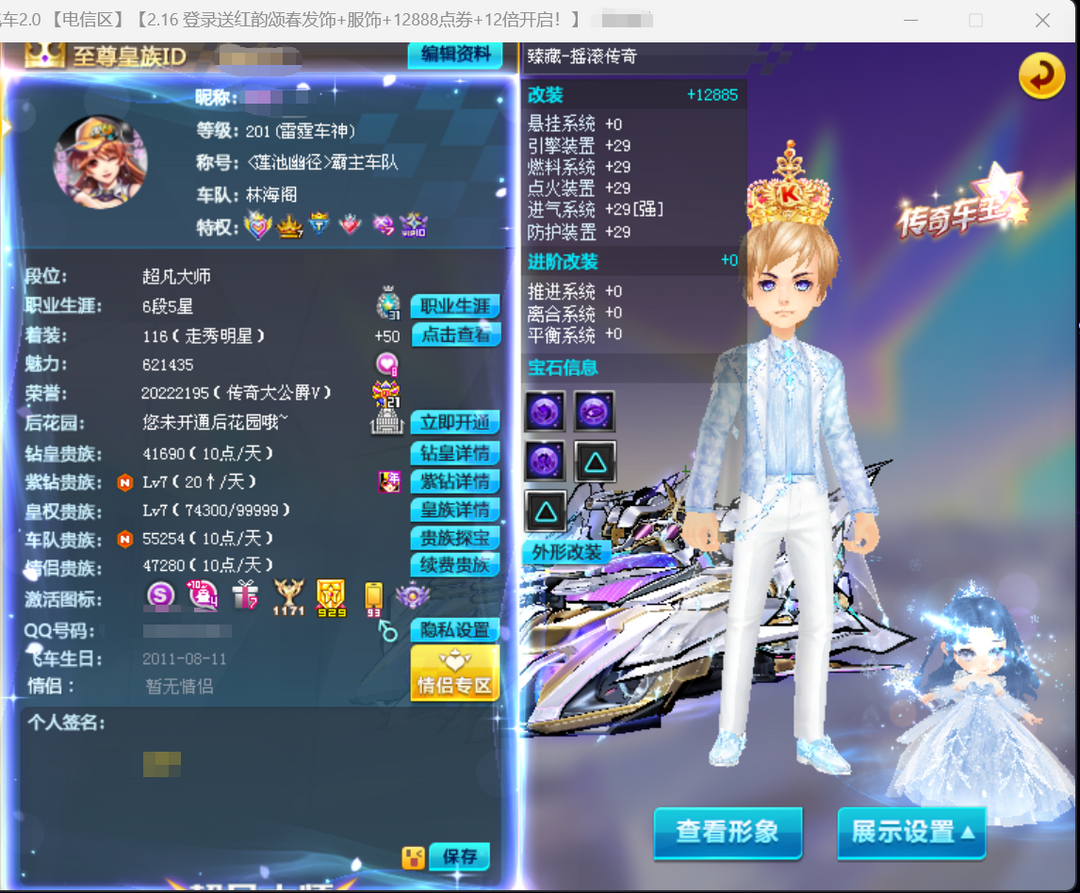 装备描述:【车王冠军皇冠】16S=满改满宝石摇滚传奇-至臻爆天甲❤️T3龙行八荒❤️玉麒麟❤️影龙烛龙-冰夷-青龙❤️耀虎❤️雪凝10❤️暴天甲奥丁❤️62万魅力超核