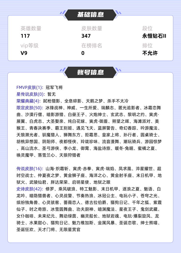 限制: 租号20次及以上 |装备描述:>>>>>>毁号,涉及毁坏虚拟财产罪及计算机安全罪,请文明游戏素质游戏,让我们共建美好租号平台>>>>>> 本游戏账号: V9用户,基础段位:永恒钻石II,英雄多,皮肤多。典藏皮肤4个,感受典藏皮肤带来的优质体验快感,FMVP皮肤1个,尽情享受FMVP皮肤带来的主角光环, 私人所属英雄皮肤有:韩信 弑枪猎影||孙尚香 杀手不太冷||孙悟空 全息碎影||小乔 天鹅之梦李信 山海·炽霜斩||鲁班七号 寅虎·瑞焰||裴擒虎 寅虎·赤拳||赵云 淬星耀世||虞姬 启明星使||李白 凤求凰||达摩 黄金狮子座||狄仁杰 超时空战士||梦奇 胖达荣荣||貂蝉 仲夏夜之梦||后羿 黄金射手座||诸葛亮 武陵仙君||武则天 海洋之心||宫本武藏 地狱之眼||孙悟空 地狱火||孙尚香 末日机甲,等等 注意事项: A.游戏过程中请不要恶意挂机或者不文明发言;B.恶意挂机、顶号等行为将被拉黑无法再次下单;C.进入游戏后中途请勿退出登陆,否则无法再次上号;D.部分账号由于异地登录可能会出现密码错误提示,通常再尝试5-6次后可上号。 |||||||||>喜欢本账号请点 ☆收藏☆ 方便下次租用,谢谢光临惠顾|||