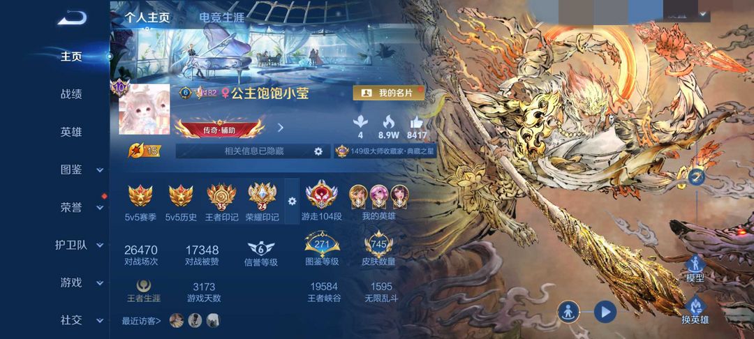 禁言⚡️在榜50强女号小国标104段游走✨猴子无相新皮✨10大国服瑶大乔孙膑✨满水晶满无双满珍品