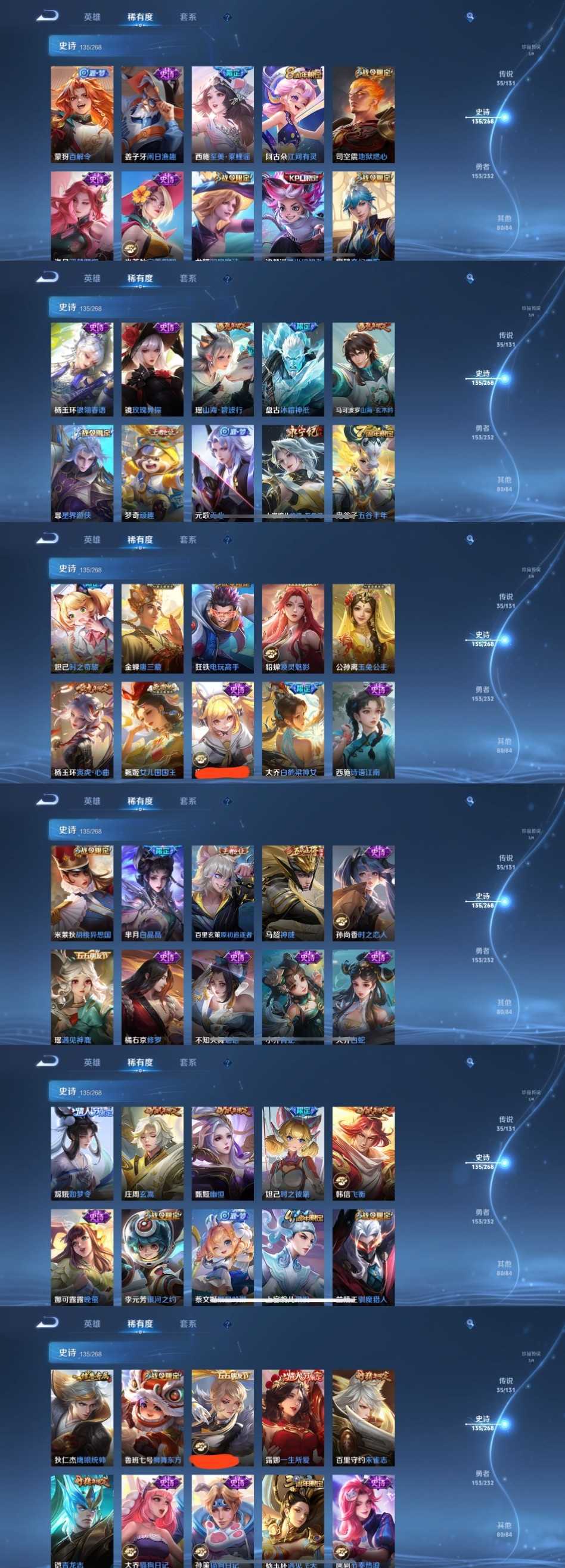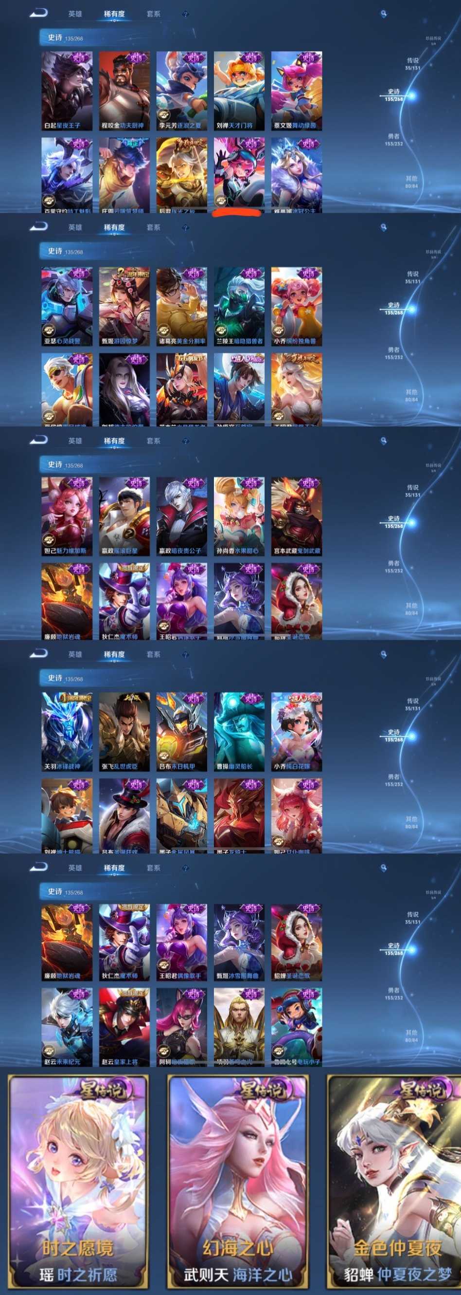 限制: 租号2次及以上 | 撤单率<49%才可租用此帐号装备描述:时间到了还登录白玩或者顶号全部改密拉黑处理永不解除,顶号机器会秒禁玩改密,顶号不仅拉黑还没得玩,赚三两块不容易,请理解谢谢。 ❤❤❤❤❤❤❤❤❤❤❤❤❤❤❤❤❤❤❤ 请勿开挂,挂机,送头,骂人,撤单后游戏等如有违规永久拉黑永不解除。 重置二级密码不要费劲了,号主每天都会上号查看,多行不义必自毙,人在做天在看,多做好事多自律,少做缺德事。 该号英雄129个皮肤416个,典藏5个,无双6个,珍品传说3哥,星传说3个,传说35个,史诗135个,祝您游戏愉快~