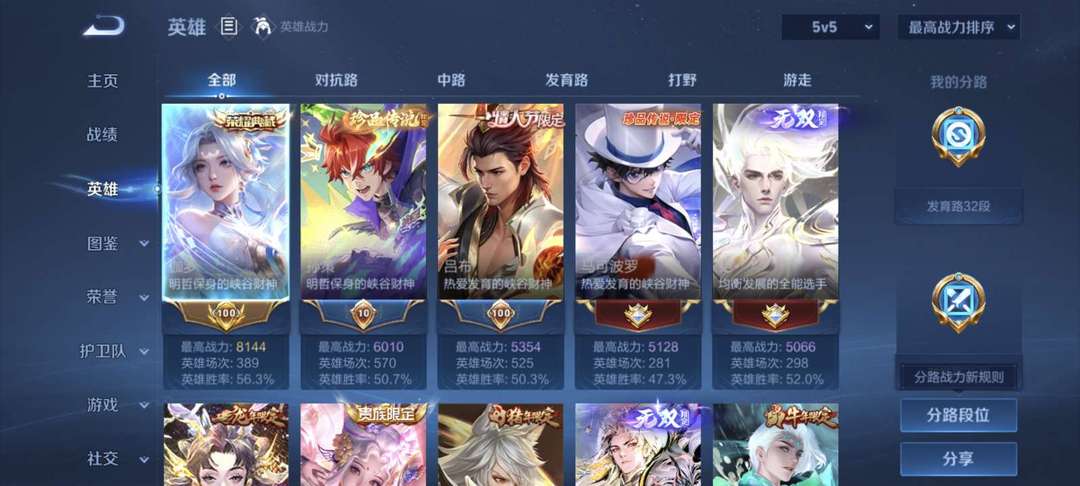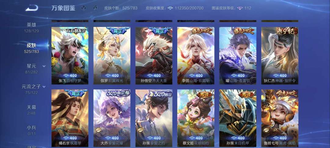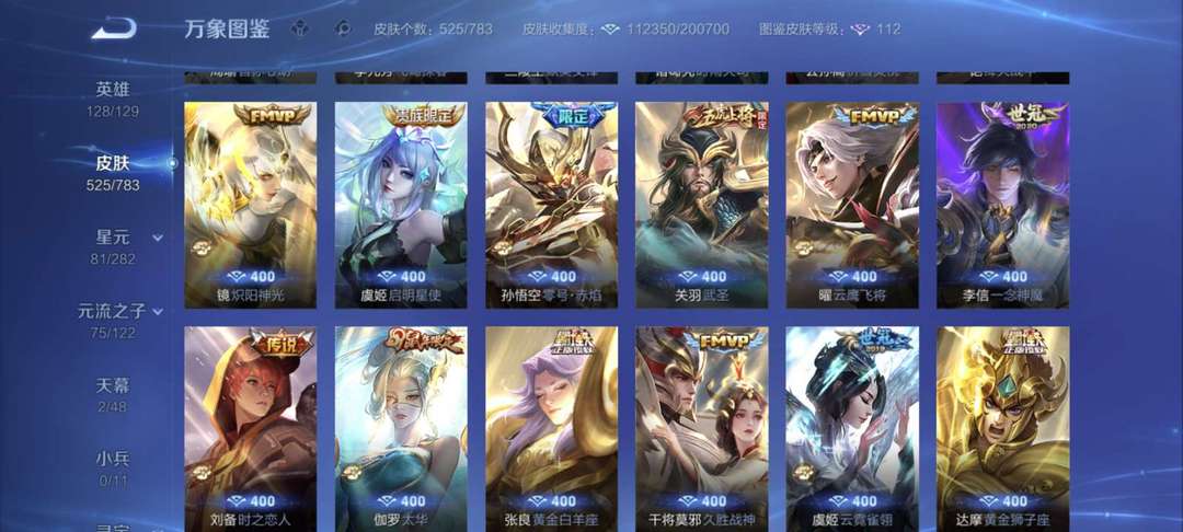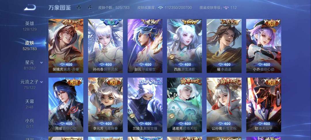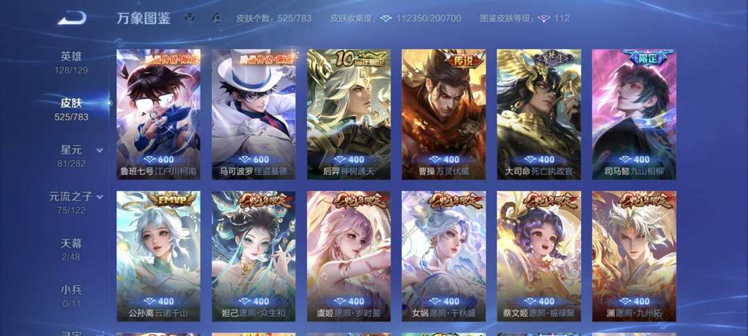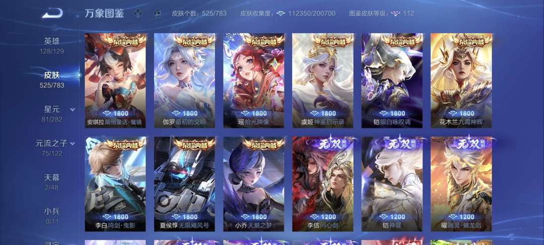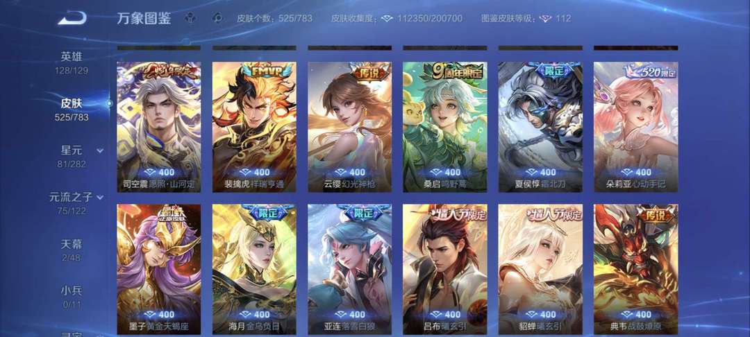 9个典藏,8个无双,3个珍品传说,传说皮肤有很多很多质量绝佳的,性价比极高