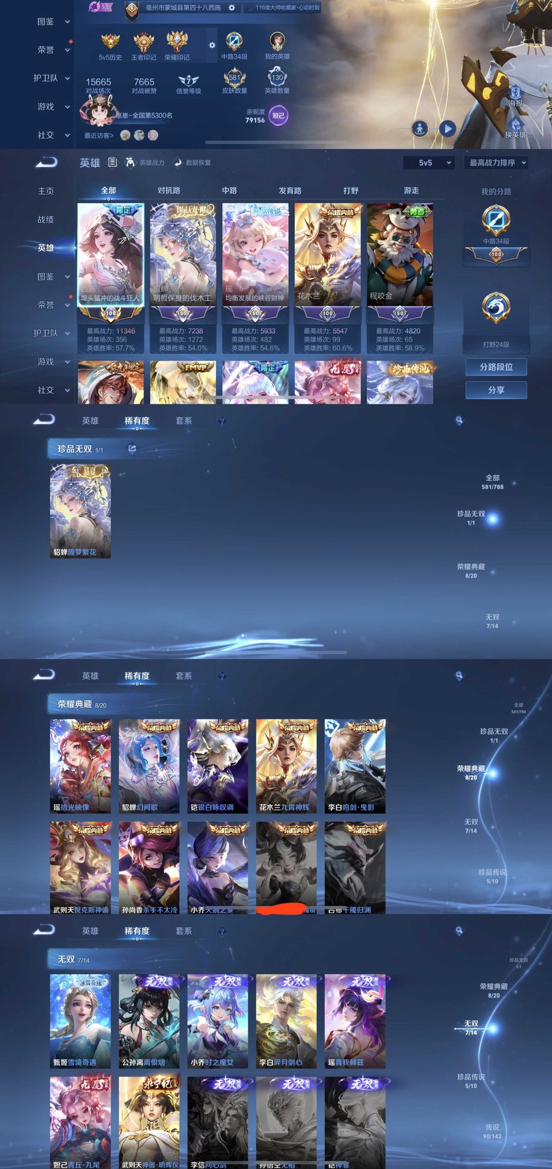 限制: 撤单率<49%才可租用此帐号装备描述:时间到了还登录白玩或者顶号全部改密拉黑处理永不解除,顶号机器会秒禁玩改密,顶号不仅拉黑还没得玩,赚三两块不容易,请理解谢谢。 ❤❤❤❤❤❤❤❤❤❤❤❤❤❤❤ 请勿开挂,挂机,送头,骂人,撤单后游戏等如有违规永久拉黑永不解除。 重置二级密码不要费劲了,号主每天都会上号查看,多行不义必自毙,人在做天在看,多做好事多自律,少做缺德事。 该号英雄130个皮肤581个,珍品无双1个,典藏9个,无双7个,珍品传说5个,星传说6个,传说90个,史诗198个,祝你游戏愉快~