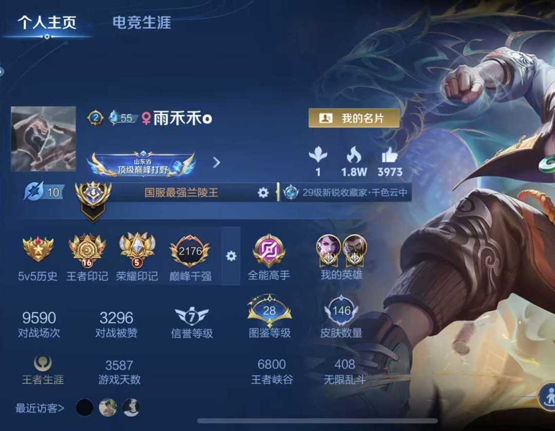巅峰千强288名框⭐11月国服双大国标兰陵王阿轲在榜⭐打野带妹号⭐可排位禁巅峰