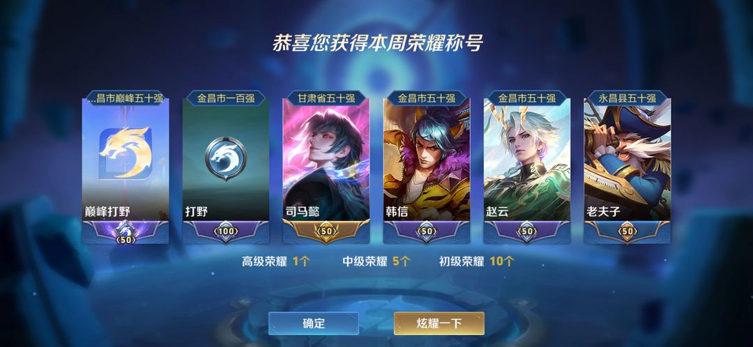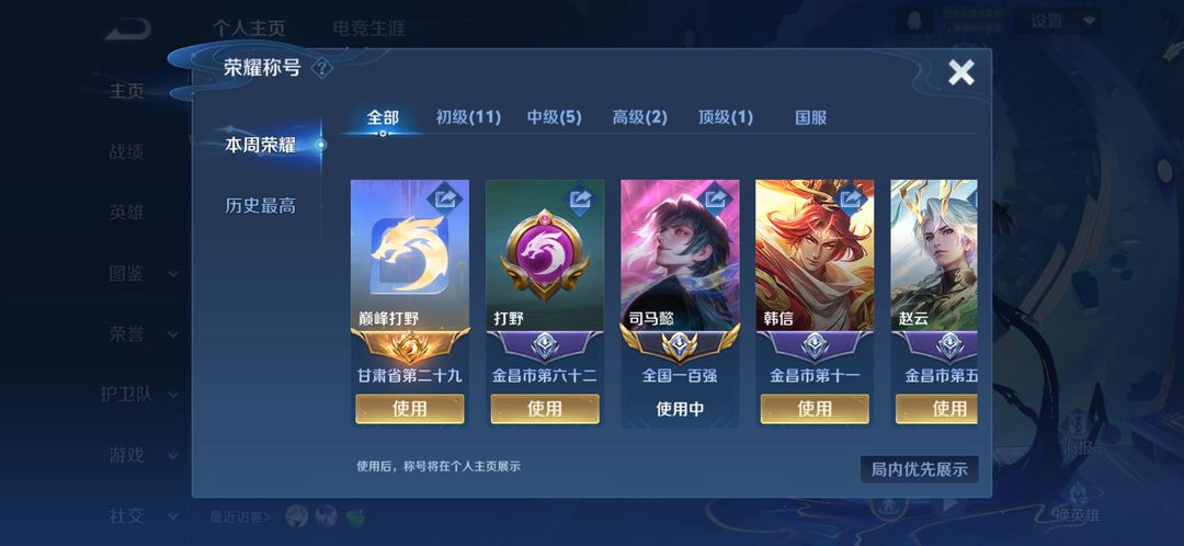 历史国服司马懿/本周在榜省15/相柳李逍遥凤求凰白虎志赤阳幽冥火金仲夏多限定皮看图