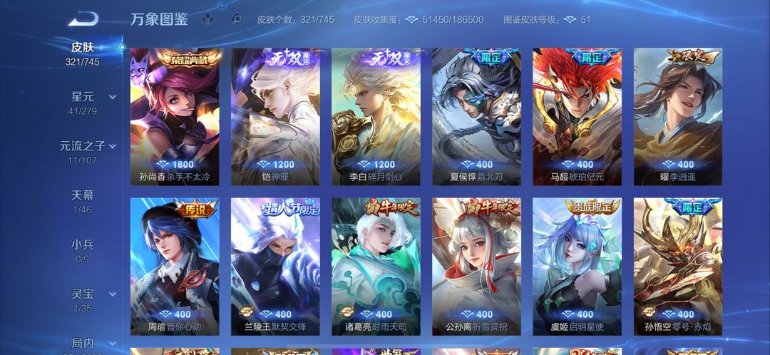 铠-无双限定皮李白无双限定皮+凤求凰马超琥珀纪元霜北刀李逍遥悟空零号赤焰至尊宝李信一念成魔杀手不太