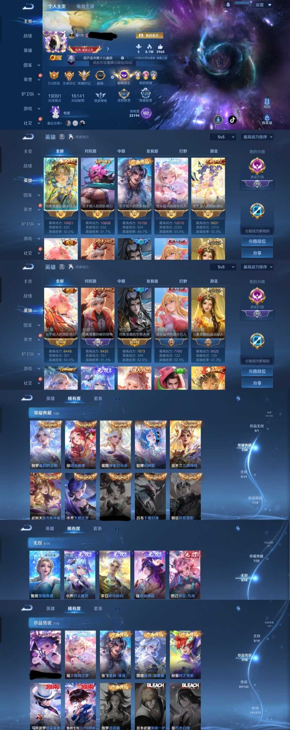 限制: 租号2次及以上 | 撤单率<49%才可租用此帐号装备描述:时间到了还登录白玩或者顶号全部改密拉黑处理永不解除,顶号机器会秒禁玩改密,顶号不仅拉黑还没得玩,赚三两块不容易,请理解谢谢。 ❤❤❤❤❤❤❤❤❤❤❤❤❤❤❤ 请勿开挂,挂机,送头,骂人,撤单后游戏等如有违规永久拉黑永不解除。 重置二级密码不要费劲了,号主每天都会上号查看,多行不义必自毙,人在做天在看,多做好事多自律,少做缺德事。 该号英雄129个皮肤591个,典藏8个,无双5个,珍品传说7个,星传说8个,传说89个,史诗193个,祝你游戏愉快~