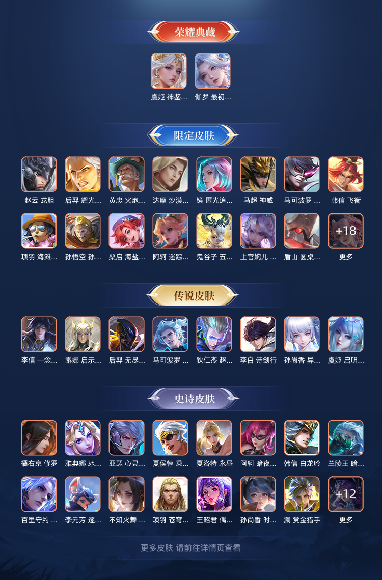 两个荣耀典藏,三十多个传说品质皮肤,二百多个皮肤,一百多个英雄.