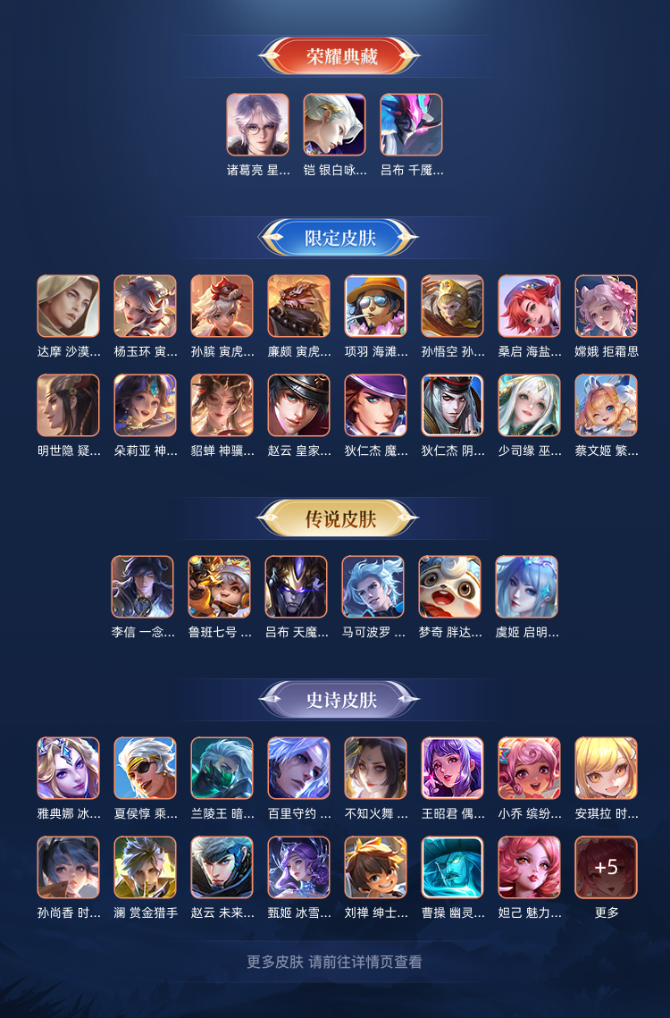 装备描述:英雄:李白(李白 千年之狐);小乔(小乔 缤纷独角兽);澜(澜 赏金猎手,澜 孤猎);貂蝉(貂蝉 神骥·聚万邦,貂蝉 异域舞娘,貂蝉 圣诞恋歌);沈梦溪(沈梦溪 棒球奇才,沈梦溪 大漠名商);李元芳(李元芳 妄想特派,李元芳 云中旅人);干将莫邪(干将莫邪 久胜战神);不知火舞(不知火舞 魅语);安琪拉(安琪拉 玩偶对对碰,安琪拉 时之奇旅);妲己(妲己 线条小狗,妲己 魅力维加斯,妲己 女仆咖啡,妲己 少女阿狸);伽罗(伽罗 沧流箭,伽罗 箭羽风息);诸葛亮(诸葛亮 掌控之力,诸葛亮 星域神启,诸葛亮 星航指挥官);兰陵王(兰陵王 傩神司,兰陵王 暗隐猎兽者,兰陵王 隐刃);墨子;马可波罗(马可波罗 深海之息,马可波罗 激情绿茵);孙策(孙策 海之征途);鲁班七号(鲁班七号 班班快跑,鲁班七号 寅虎·瑞焰);李信(李信 灼热之刃,李信 一念神魔);夏侯惇(夏侯惇 乘风破浪);百里守约(百里守约 绝影神枪,百里守约 特工魅影);孙尚香(孙尚香 水果甜心,孙尚香 时之恋人,孙尚香 沉稳之力);狄仁杰(狄仁杰 阴阳师,狄仁杰 魔术师,狄仁杰 万华元夜);吕布(吕布 舞狮寰,吕布 千魇归渊,