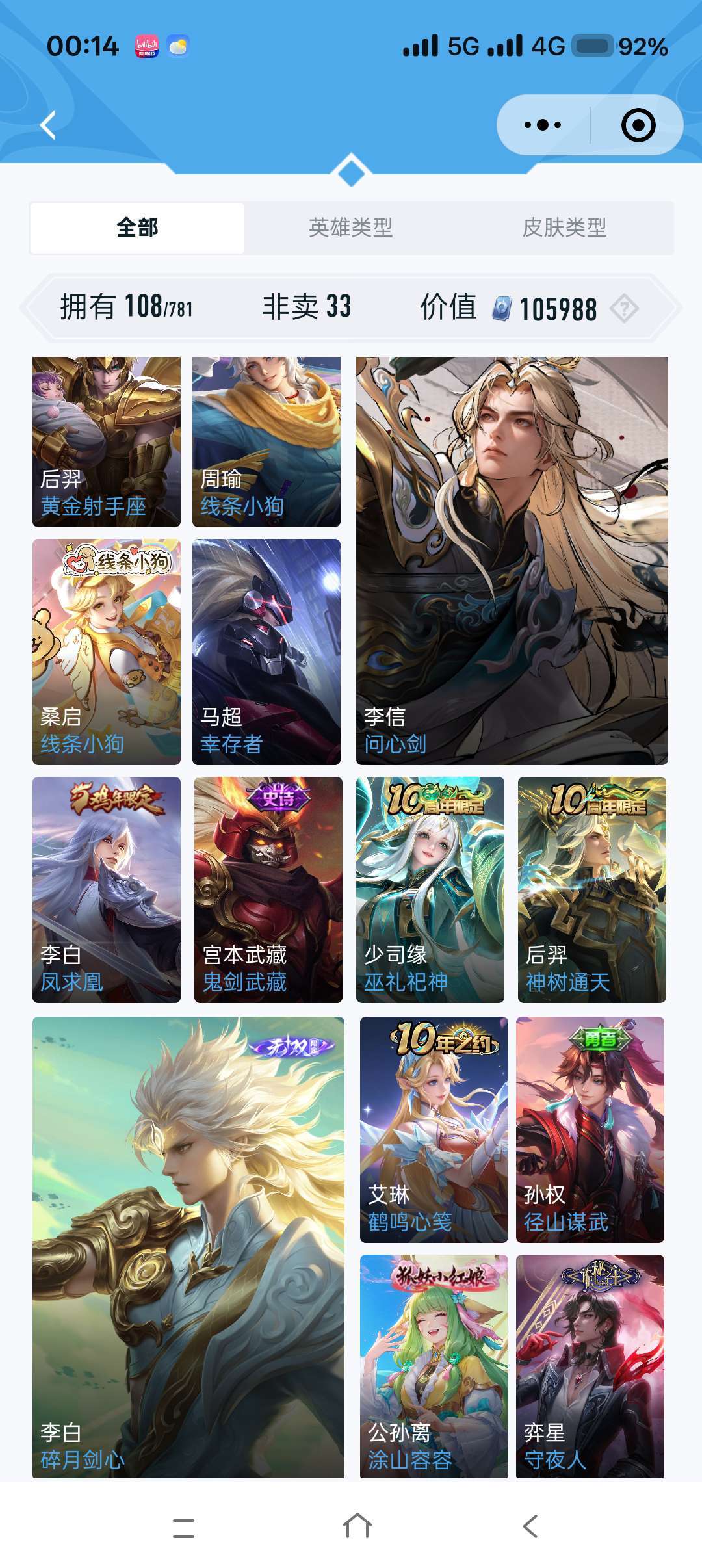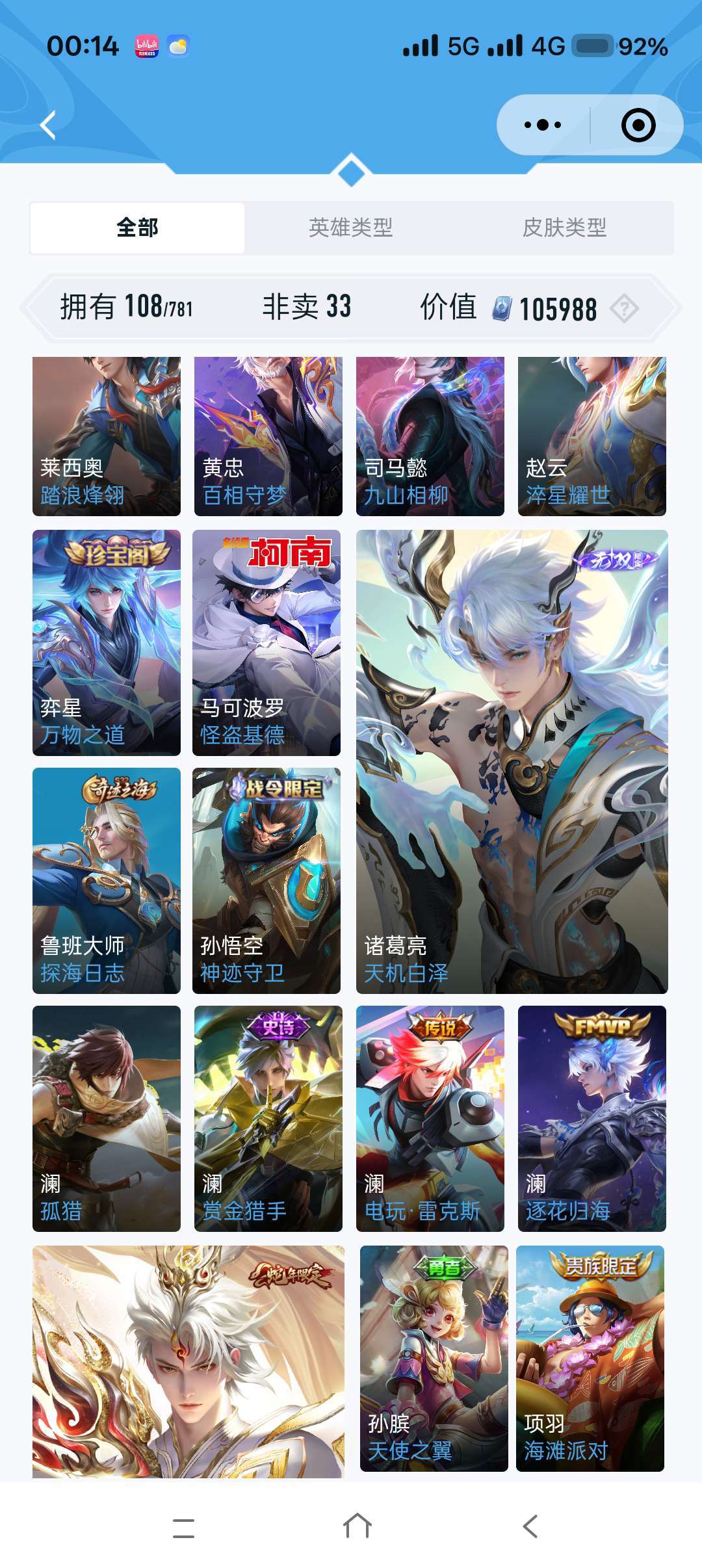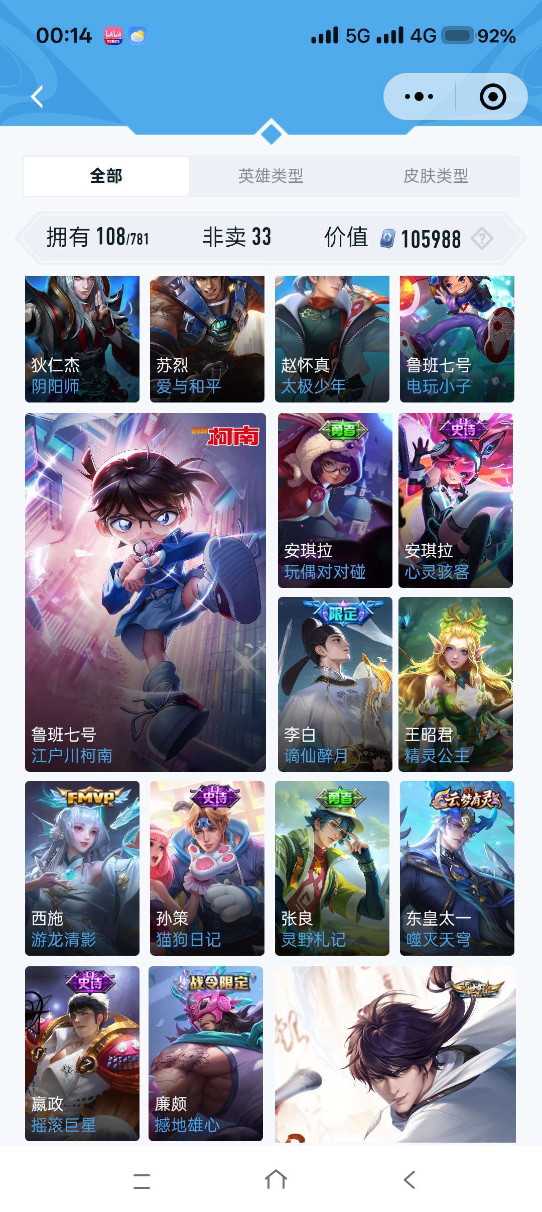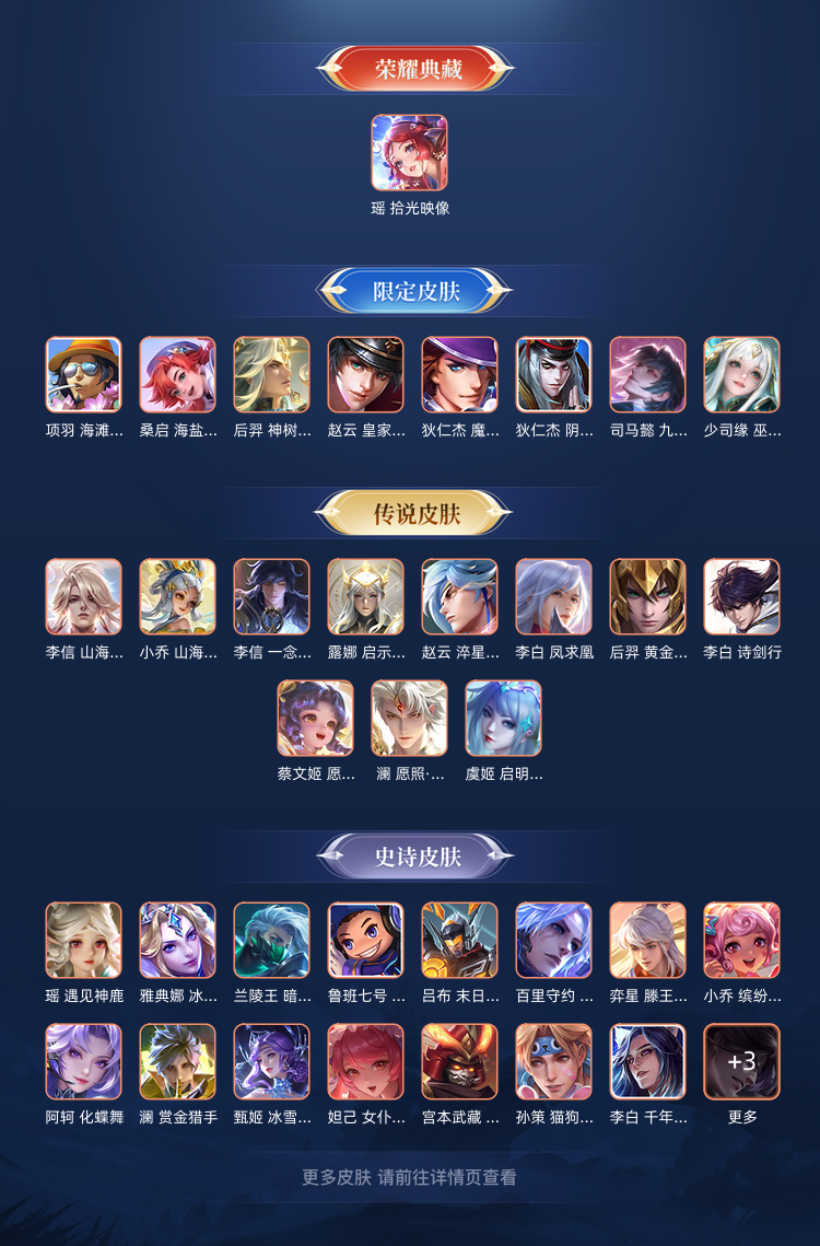 装备描述:李信全皮无双问心剑兔限 李白伪全皮无双碎月剑心凤求凰无典藏 澜全皮逐花归海电玩蛇限 瑶荣耀典藏拾光映像大耳狗之梦 小乔兔限 诸葛亮天机白泽 名侦探柯南怪盗基德 蔡文姬蛇限