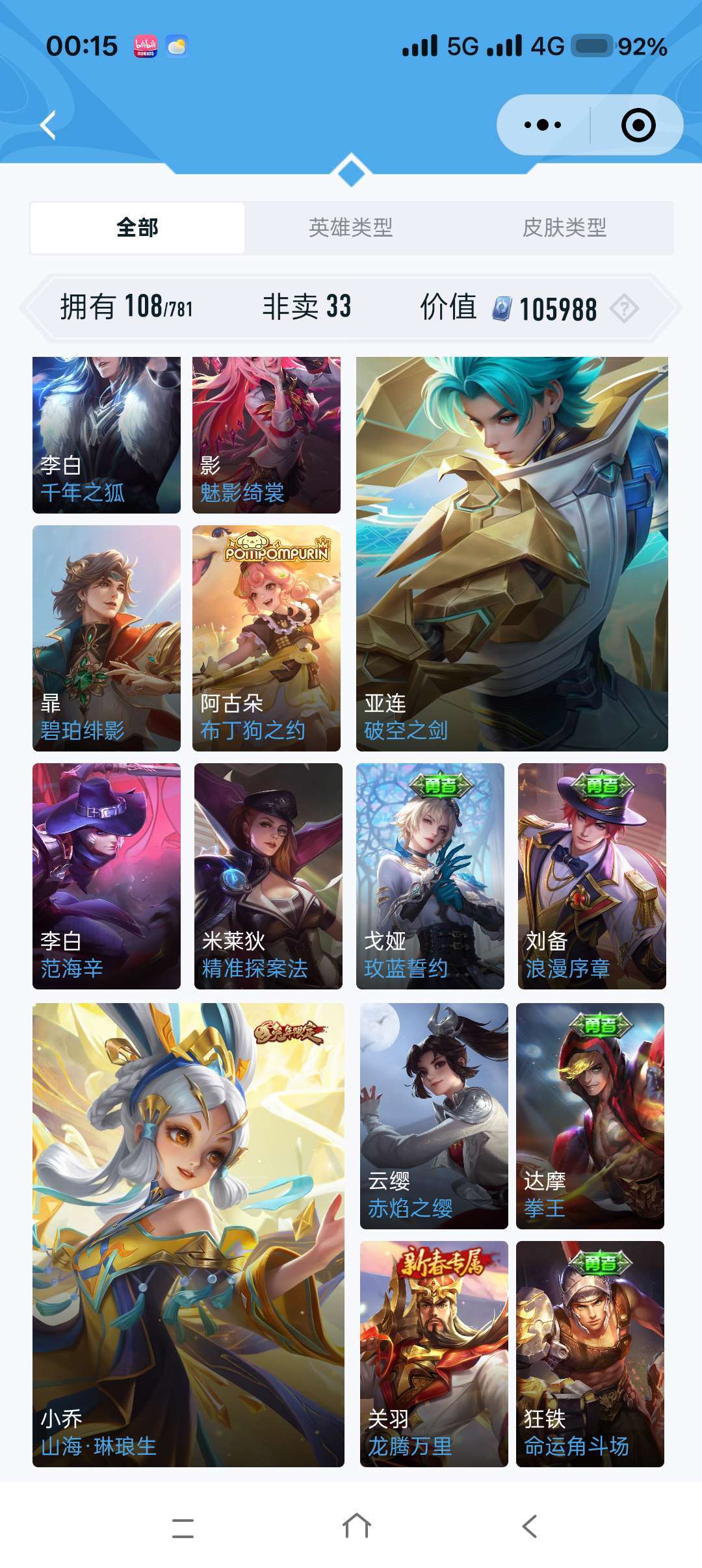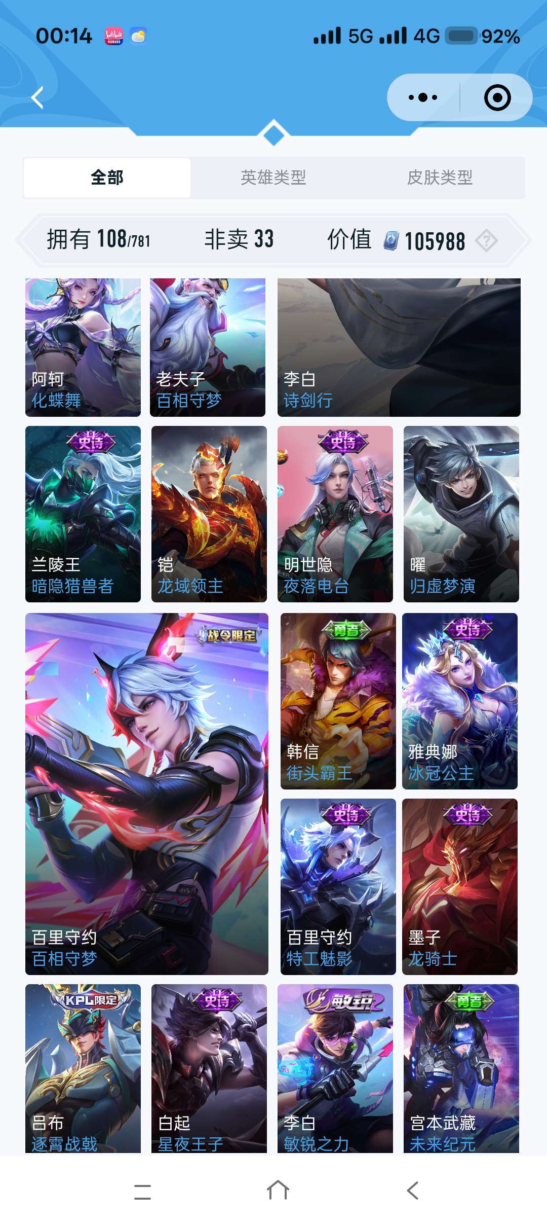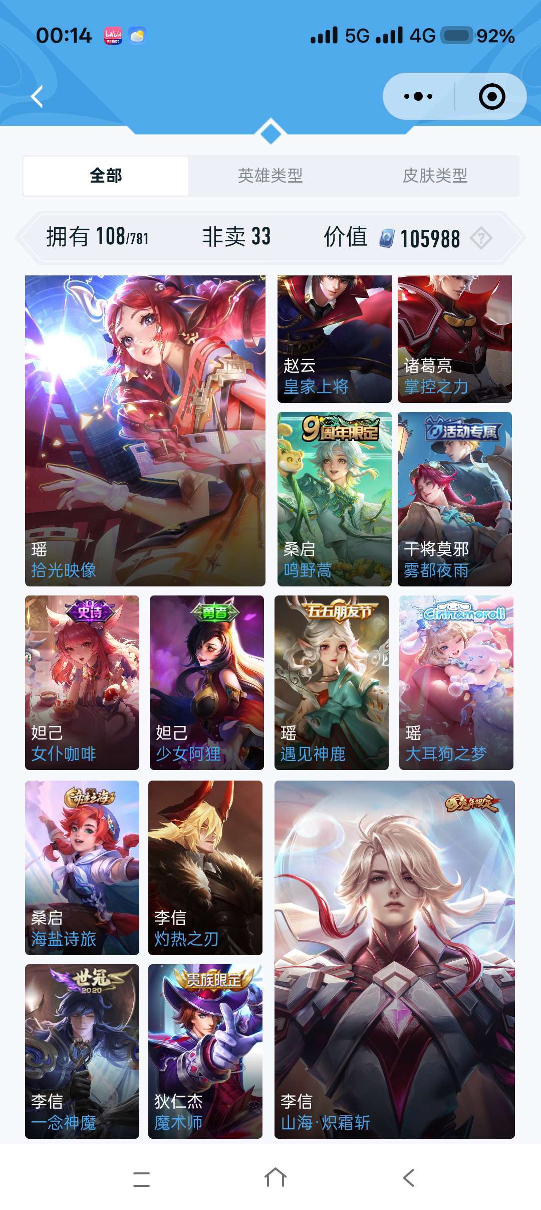装备描述:李信全皮无双问心剑兔限 李白伪全皮无双碎月剑心凤求凰无典藏 澜全皮逐花归海电玩蛇限 瑶荣耀典藏拾光映像大耳狗之梦 小乔兔限 诸葛亮天机白泽 名侦探柯南怪盗基德 蔡文姬蛇限