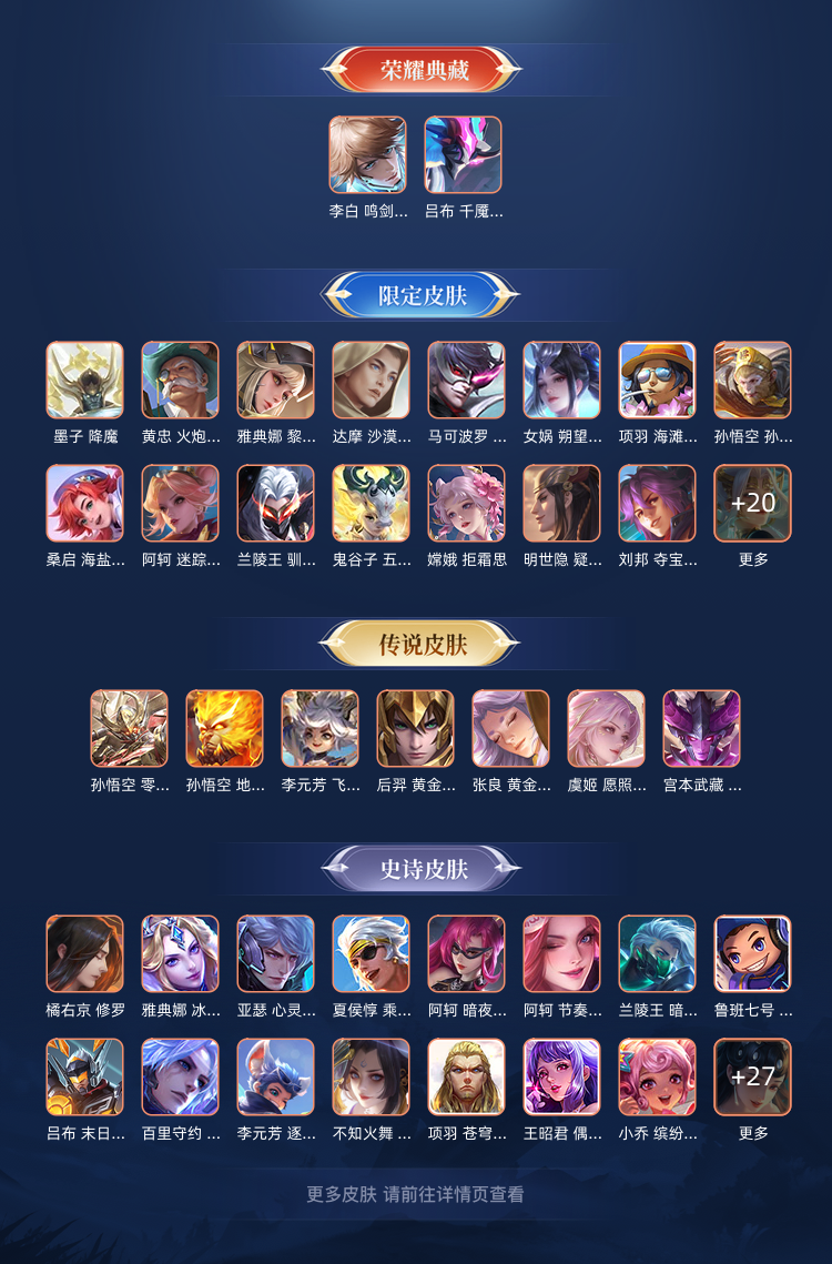 典藏皮肤+限定皮肤+传说皮肤+史诗皮肤铭文满级