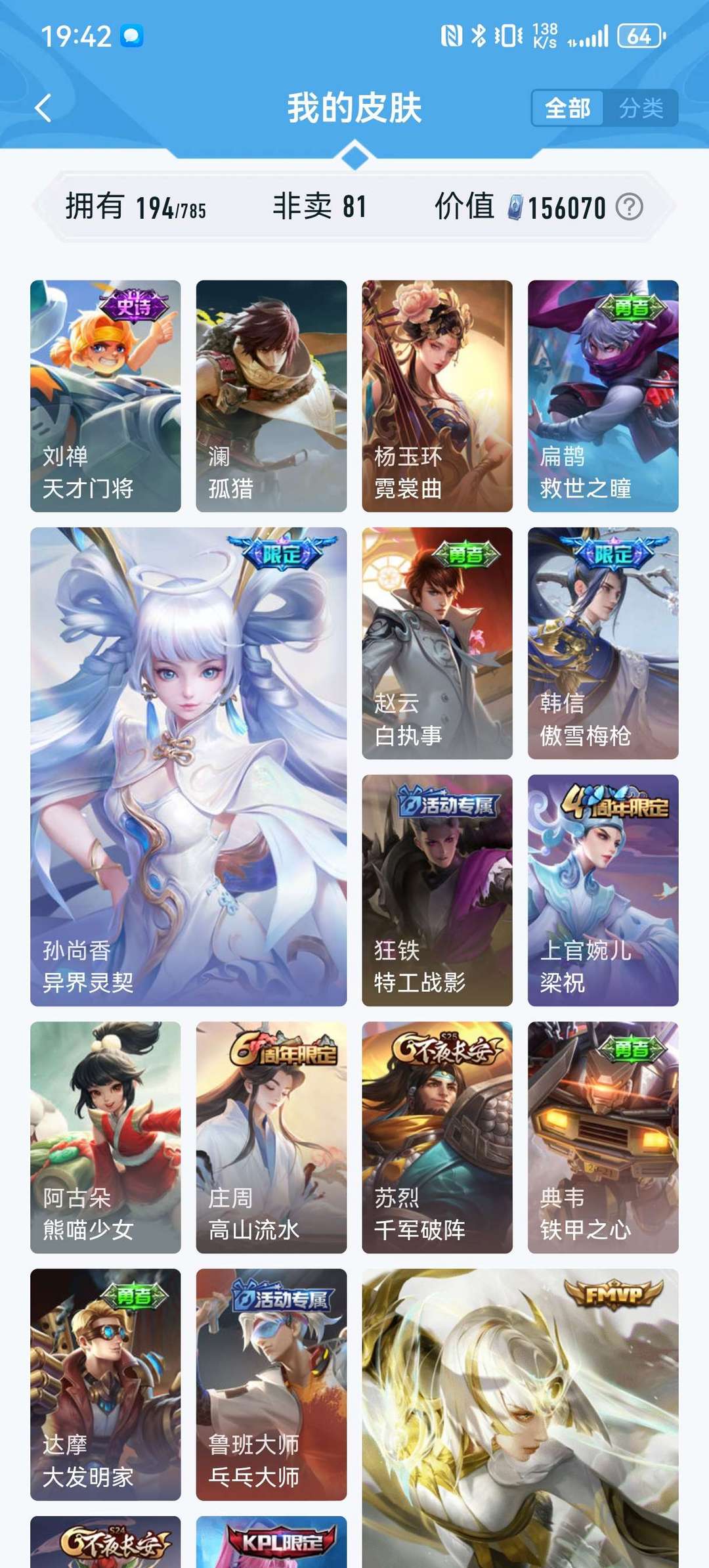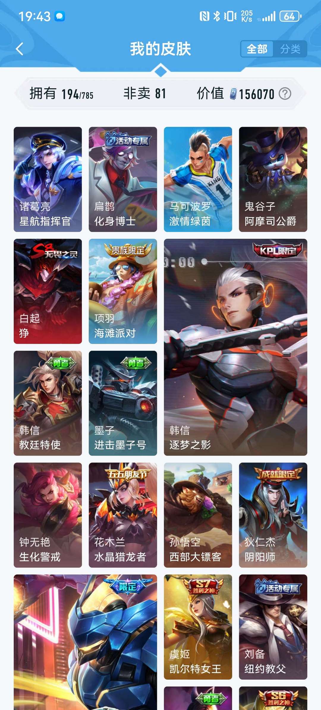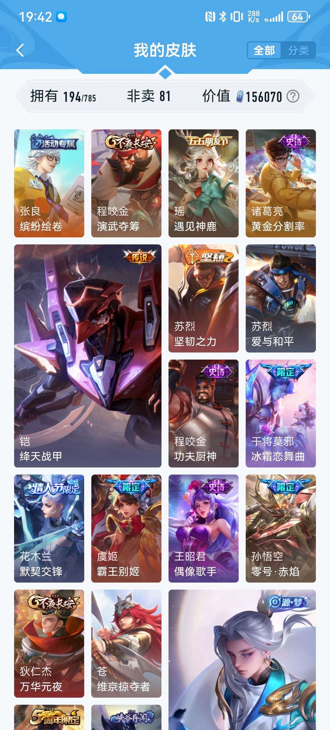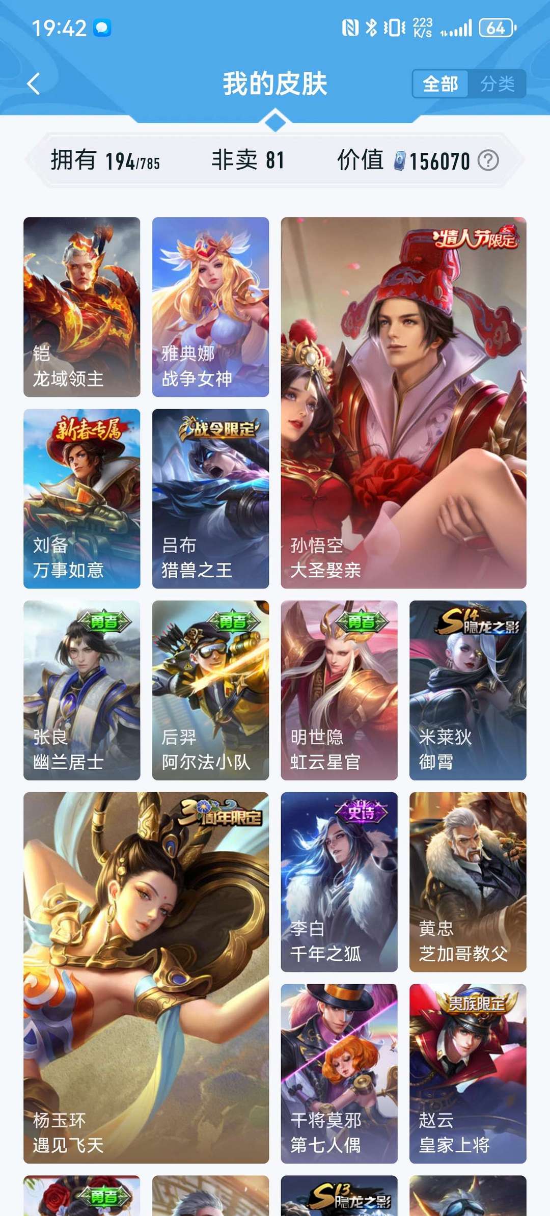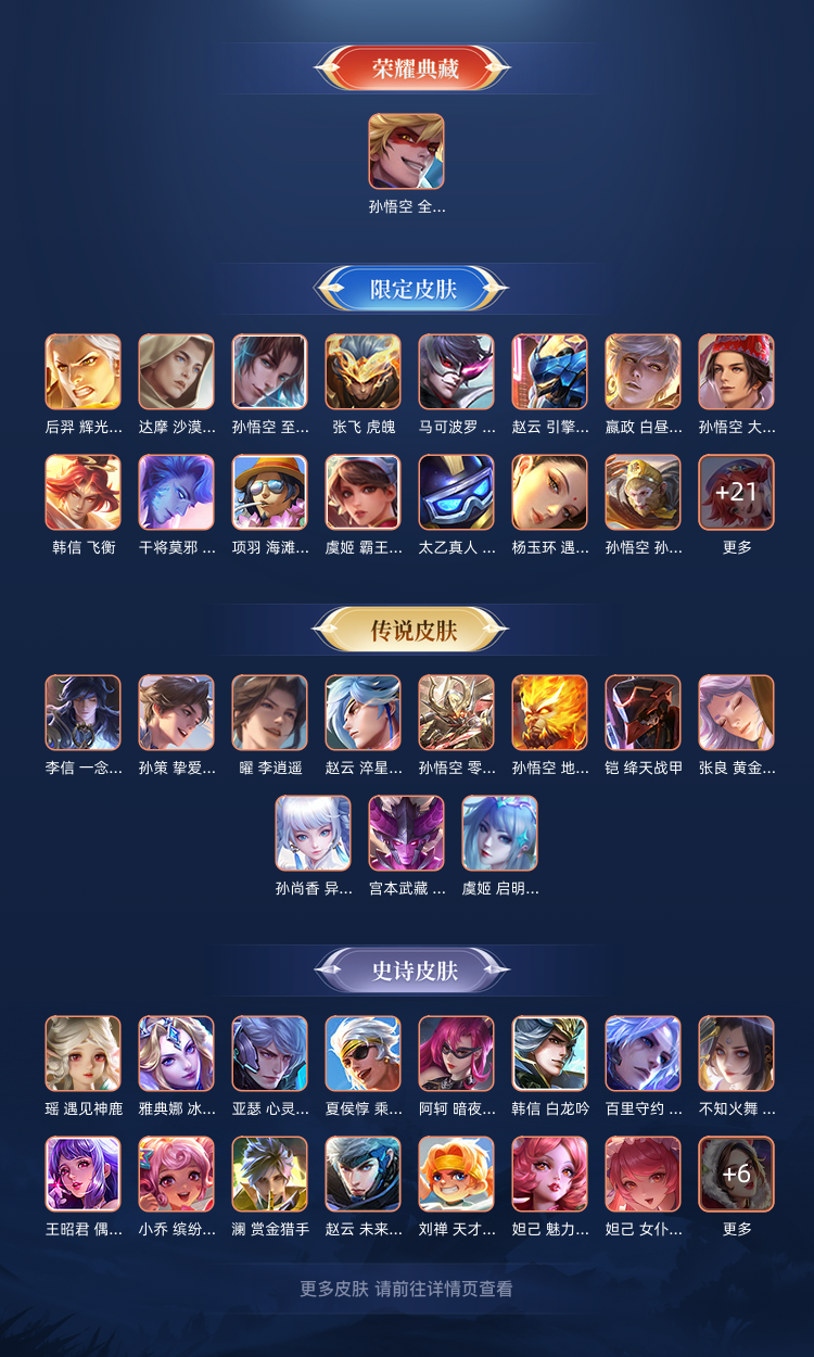 英雄127个,皮肤194个,限定荣耀典藏传说基本都有,现在不怎么玩想玩的可以拿去玩
