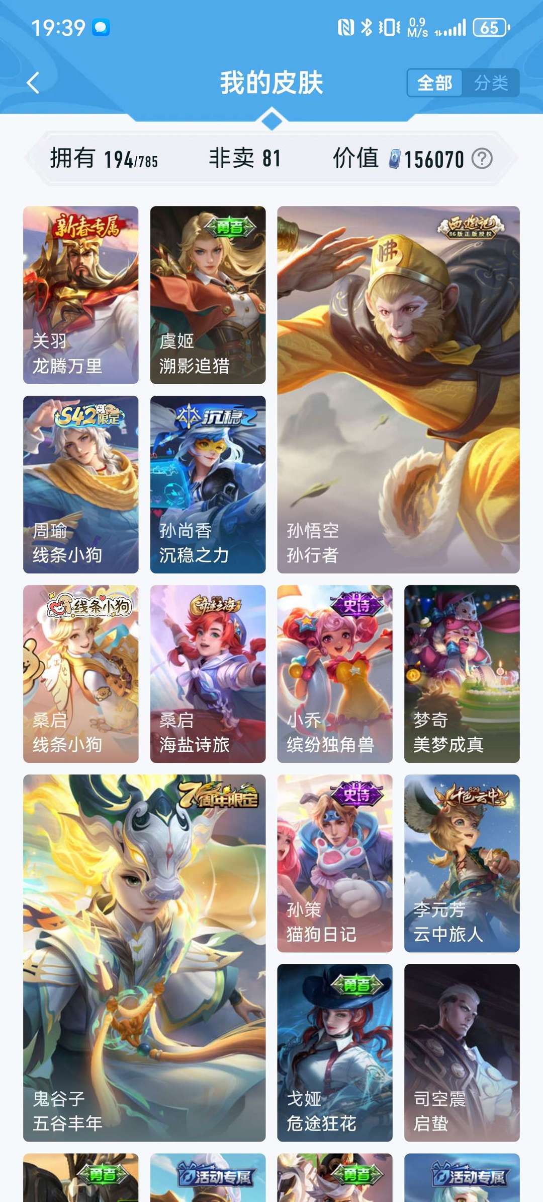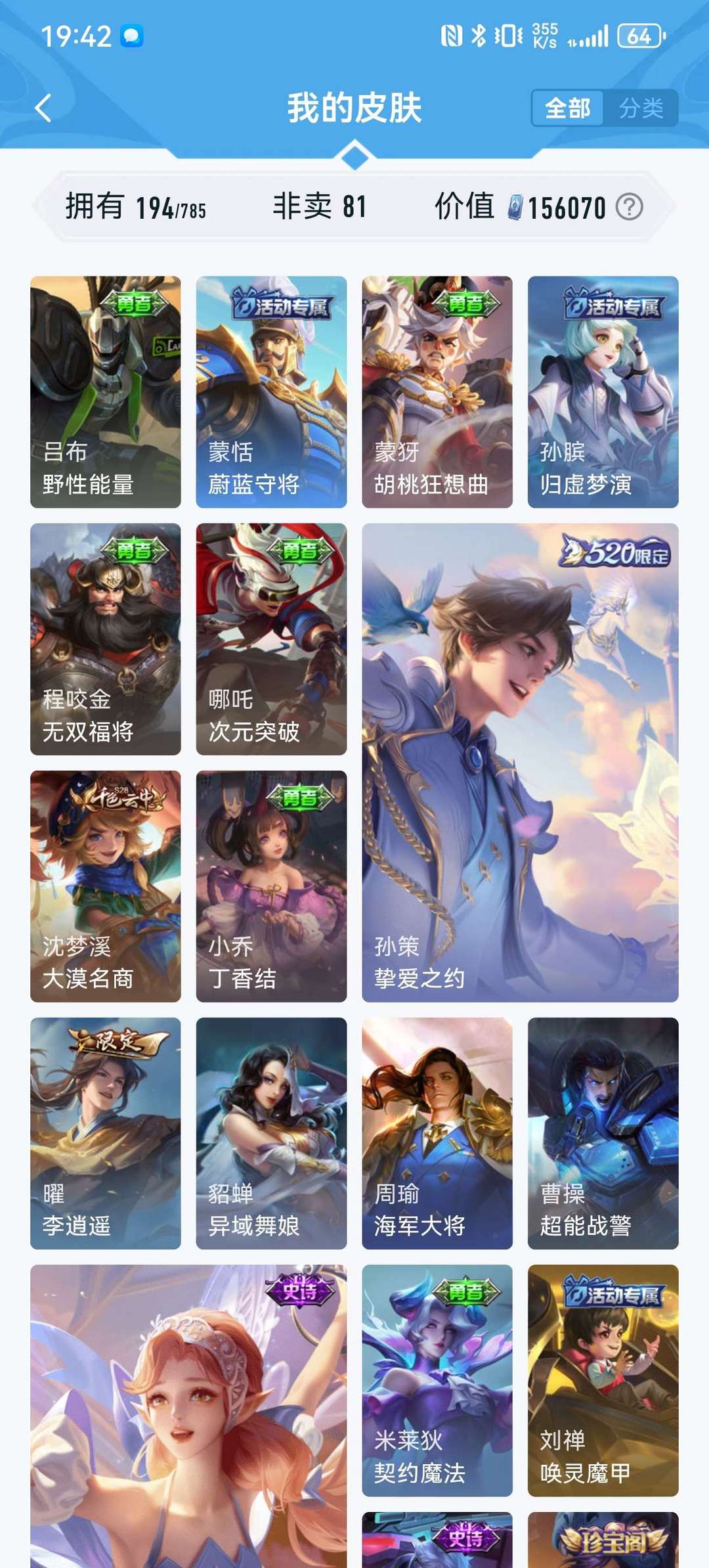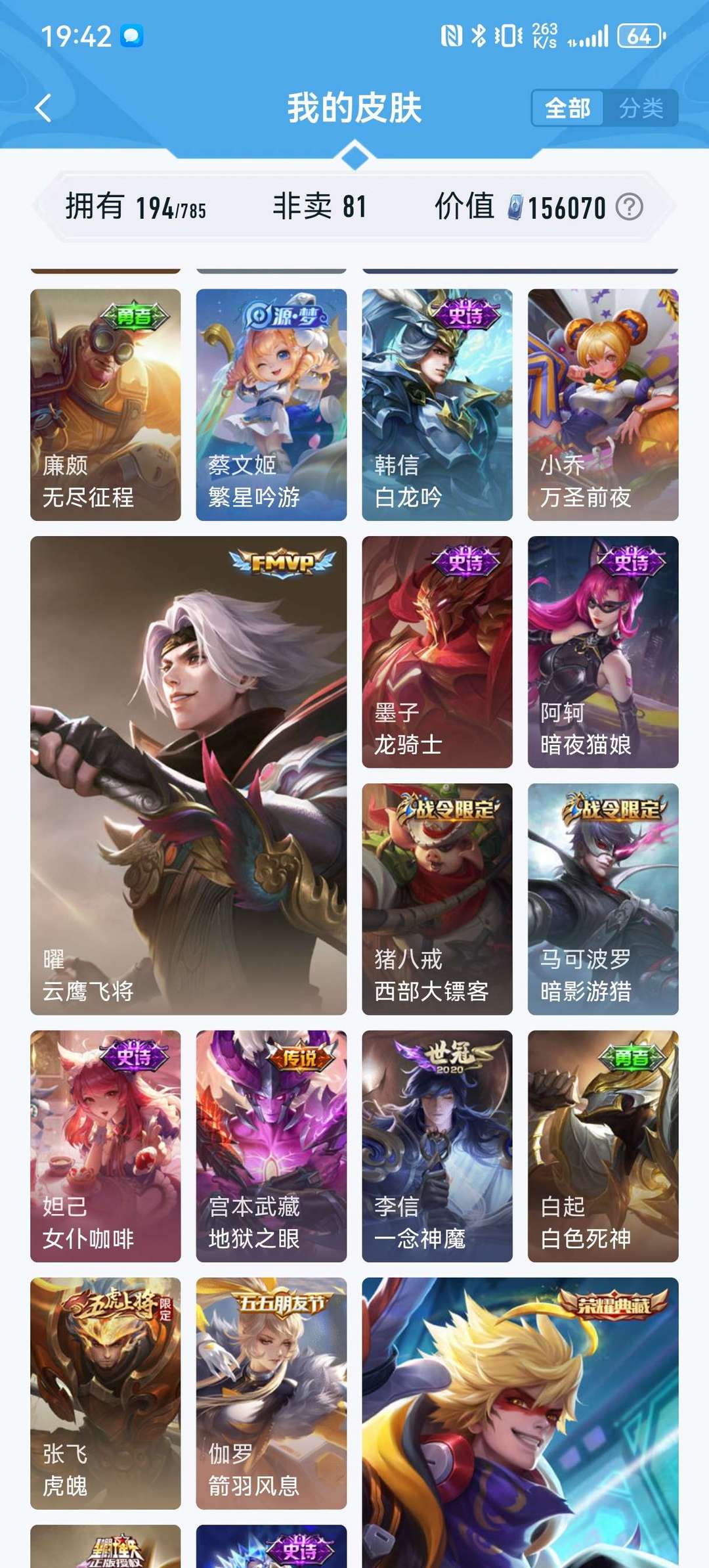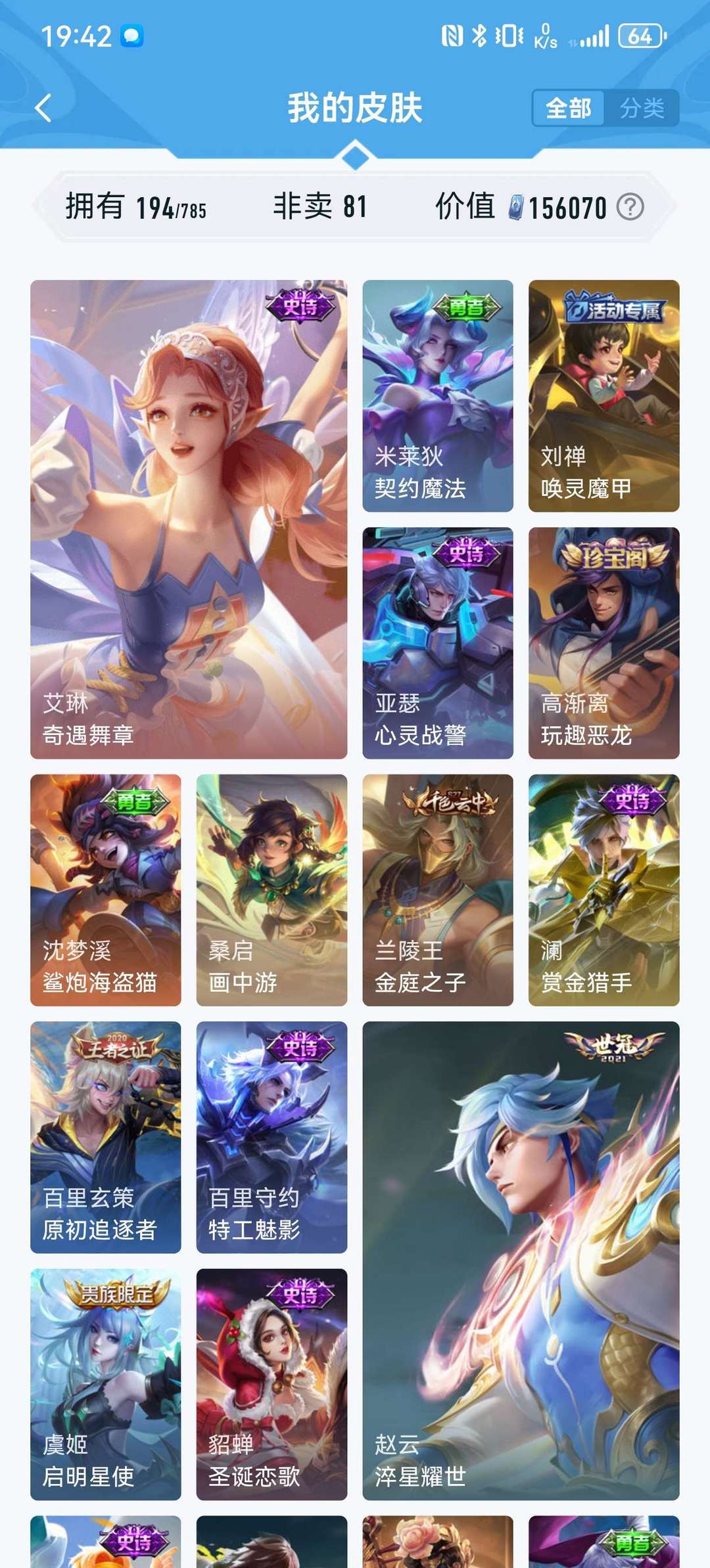 英雄127个,皮肤194个,限定荣耀典藏传说基本都有,现在不怎么玩想玩的可以拿去玩