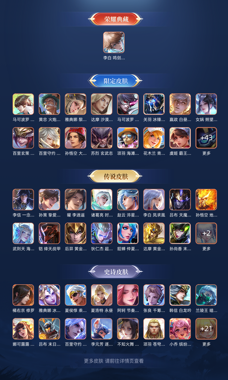 李白荣耀典藏、孙悟空无双、多传说/限定/战令/周年庆皮(差2个全英雄,全位置热门英雄