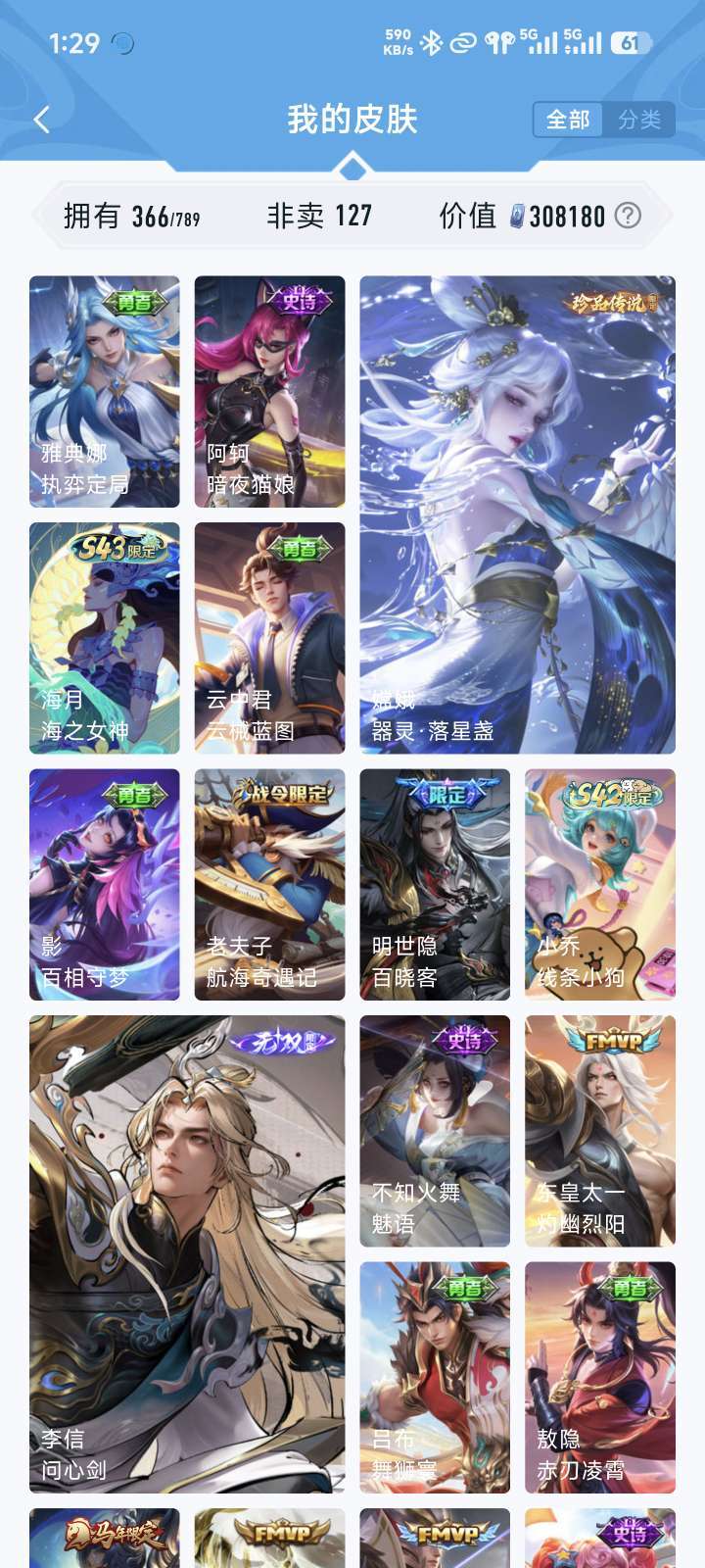 超多稀有皮肤+超多英雄+150铭文+王者段位