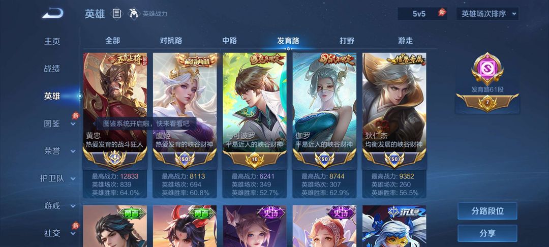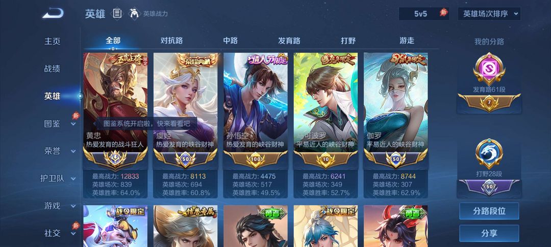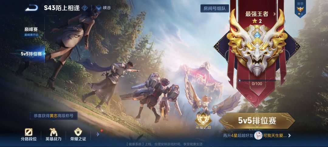 历史国服1万3黄忠扁鹊 发育路61段。现在巅峰1400。有至尊宝王者两颗星可排位。