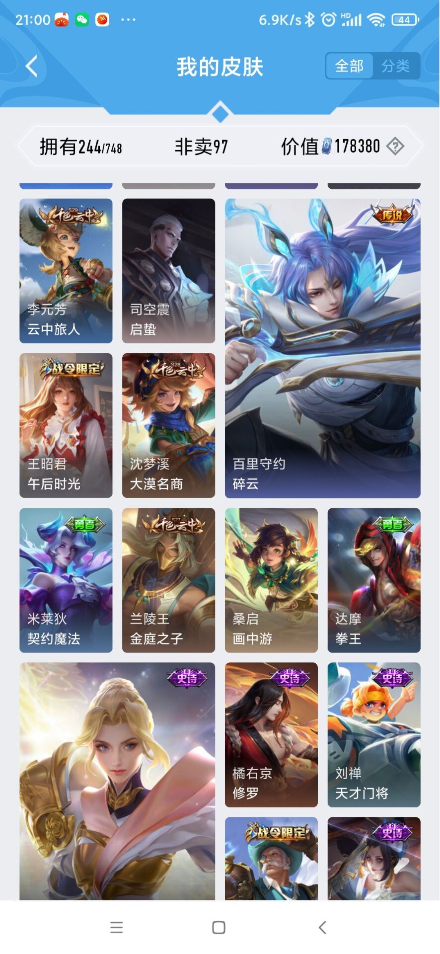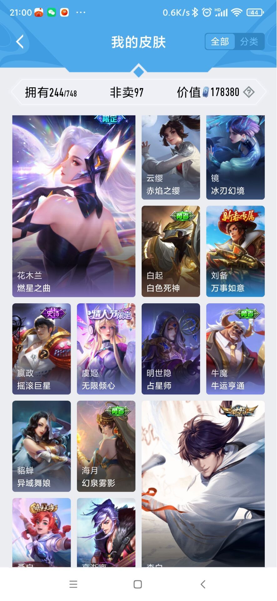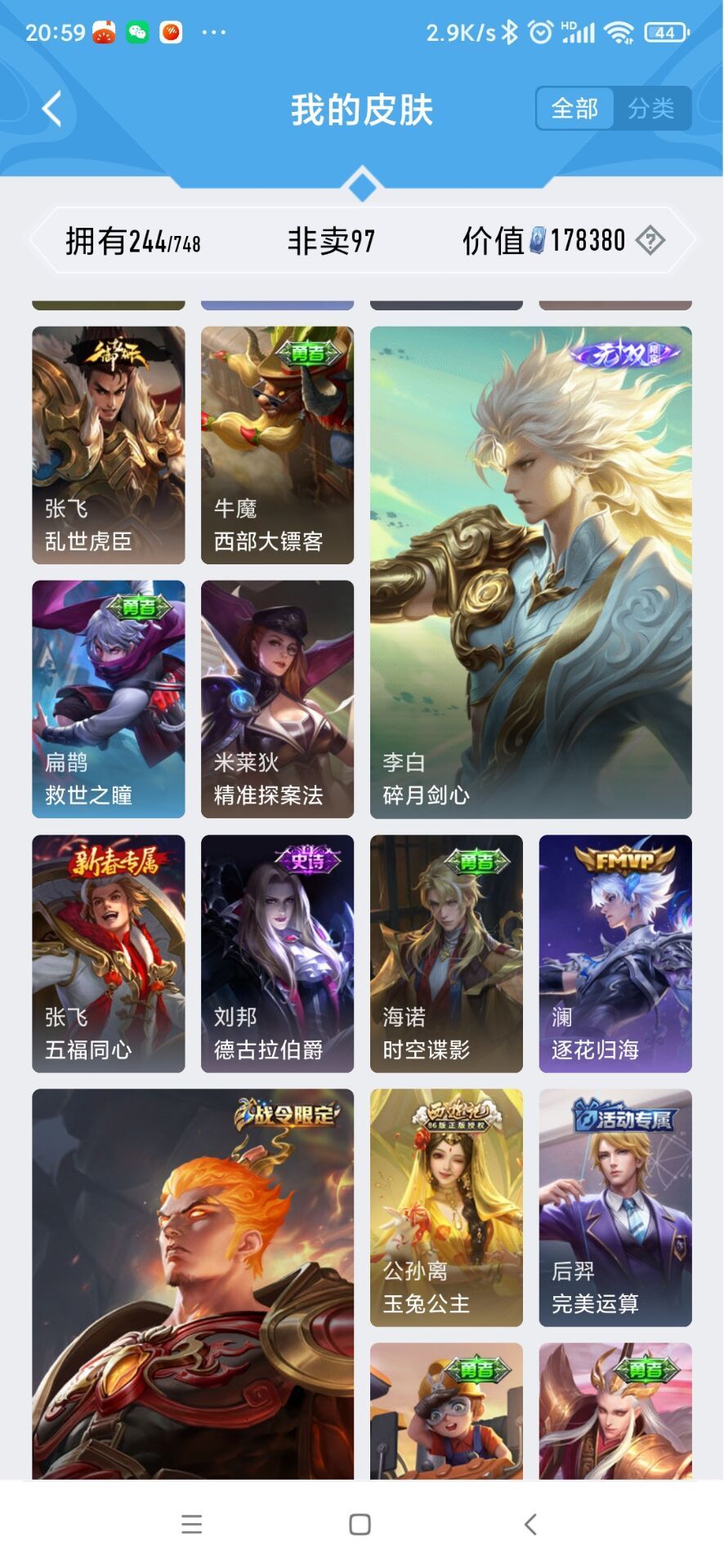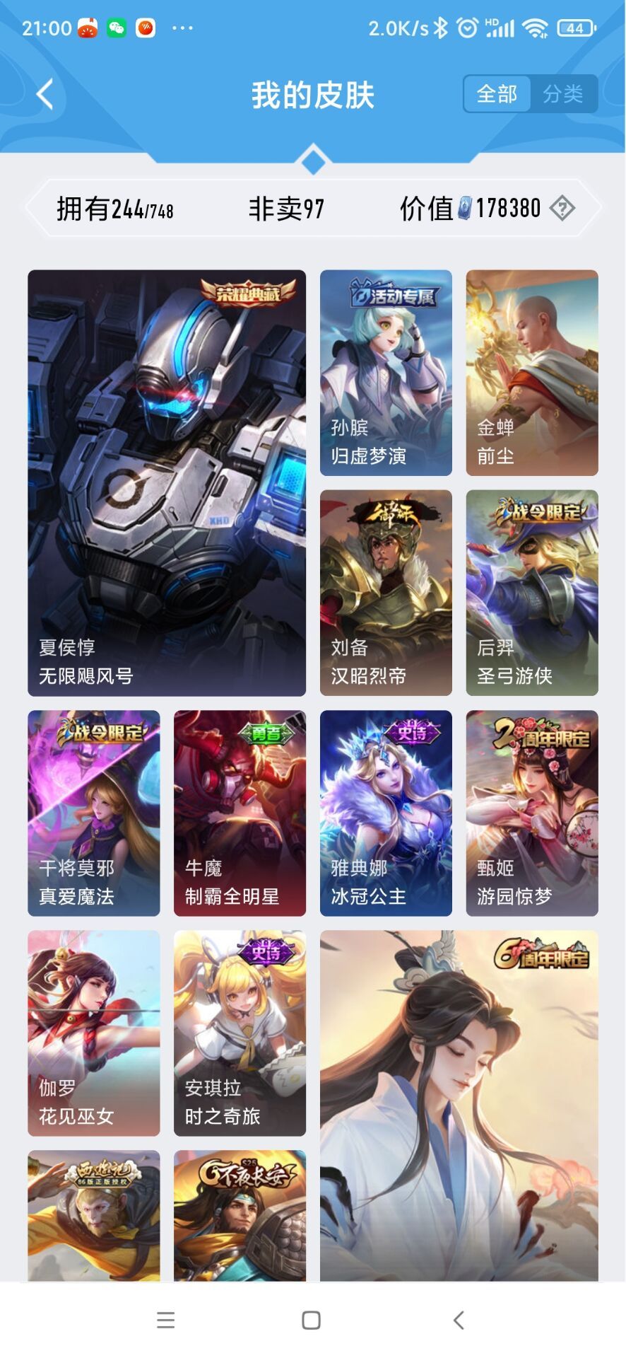 装备描述:英雄:【孙悟空(孙悟空 地狱火, 孙悟空 西部大镖客, 孙悟空 孙行者),太乙真人(太乙真人 圆桌骑士, 太乙真人 饕餮),王昭君(王昭君 幻想奇妙夜, 王昭君 午后时光, 王昭君 星穹之声),海月(海月 幻泉雾影),赵怀真(赵怀真 太极少年),夏侯惇(夏侯惇 战争骑士, 夏侯惇 无限飓风号, 夏侯惇 朔风刀),莱西奥(莱西奥 西部游侠),项羽(项羽 帝国元帅, 项羽 海滩派对),小乔(小乔 缤纷独角兽, 小乔 万圣前夜, 小乔 丁香结),雅典娜(雅典娜 冰冠公主, 雅典娜 单词大作战),孙权,亚瑟(亚瑟 狮心王, 亚瑟 死亡骑士, 亚瑟 心灵战警, 亚瑟 荣光之誓),杨戬(杨戬 埃及法老, 杨戬 次元傲视),苍(苍 维京掠夺者),杨玉环(杨玉环 遇见飞天),弈星(弈星 踏雪寻梅, 弈星 混沌棋),嬴政(嬴政 摇滚巨星),虞姬(虞姬 霸王别姬, 虞姬 加勒比小姐, 虞姬 凯尔特女王, 虞姬 云霓雀翎, 虞姬 启明星使, 虞姬 无限倾心),张飞(张飞 乱世虎臣, 张飞 五福同心),张良(张良 一千零一夜, 张良 古海寻踪),赵云(赵云 皇家上将, 赵云 忍·炎影),金蝉(金蝉 前尘),甄