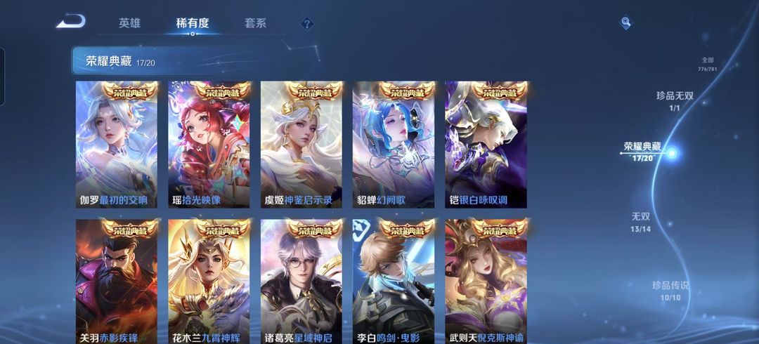 李信无双/安琪拉典藏/马年限定/李元芳星君娄金/孙悟空无相/貂蝉馥梦繁华/满皮肤/限定天幕/满珍品