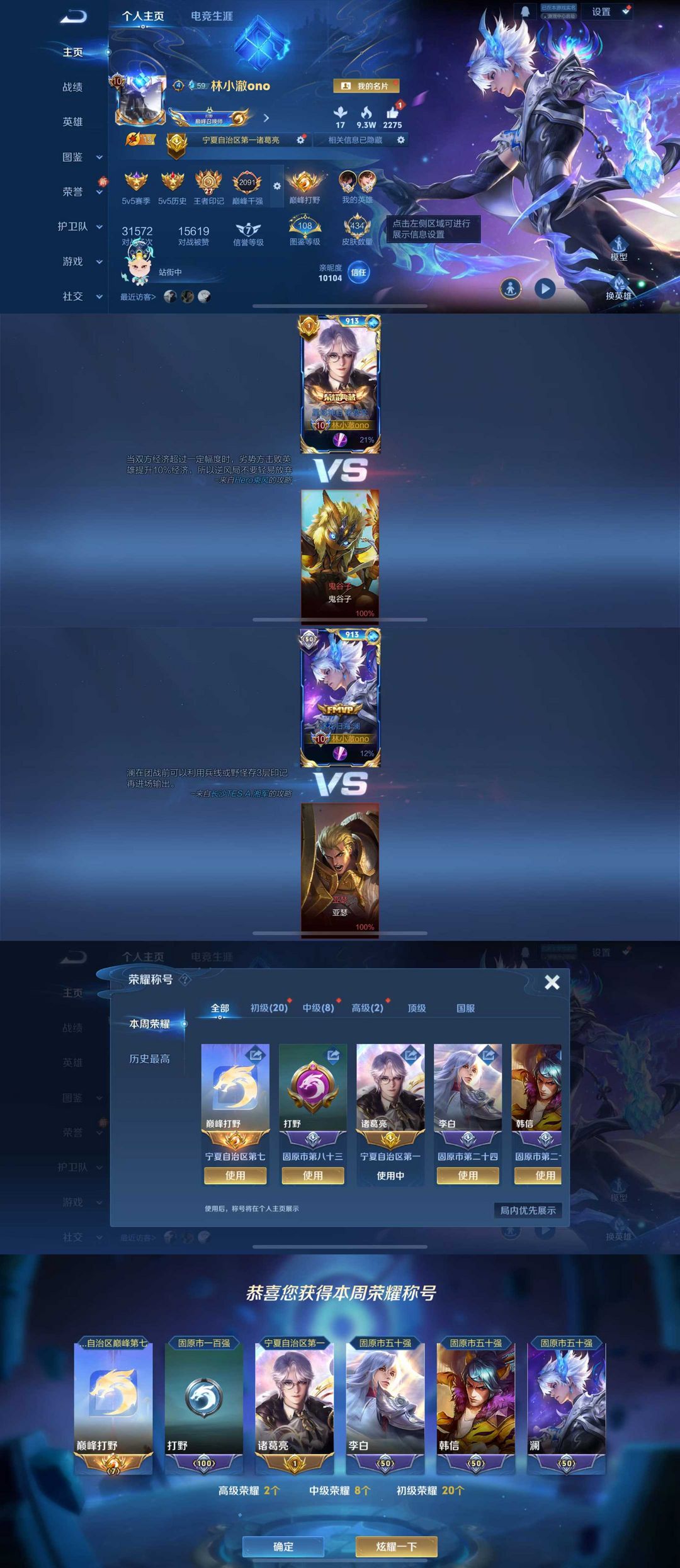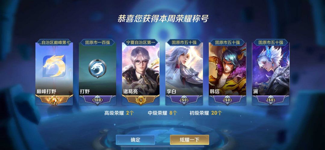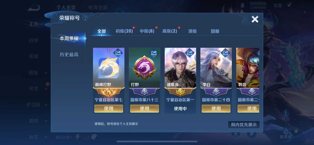 【本周打野巅峰千强九百名♥在榜省标诸葛亮】闪电框♥韩信火舞无双梅西♥巅峰相框♥蛇年全年限♥不可巅峰
