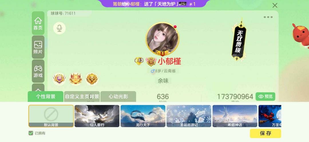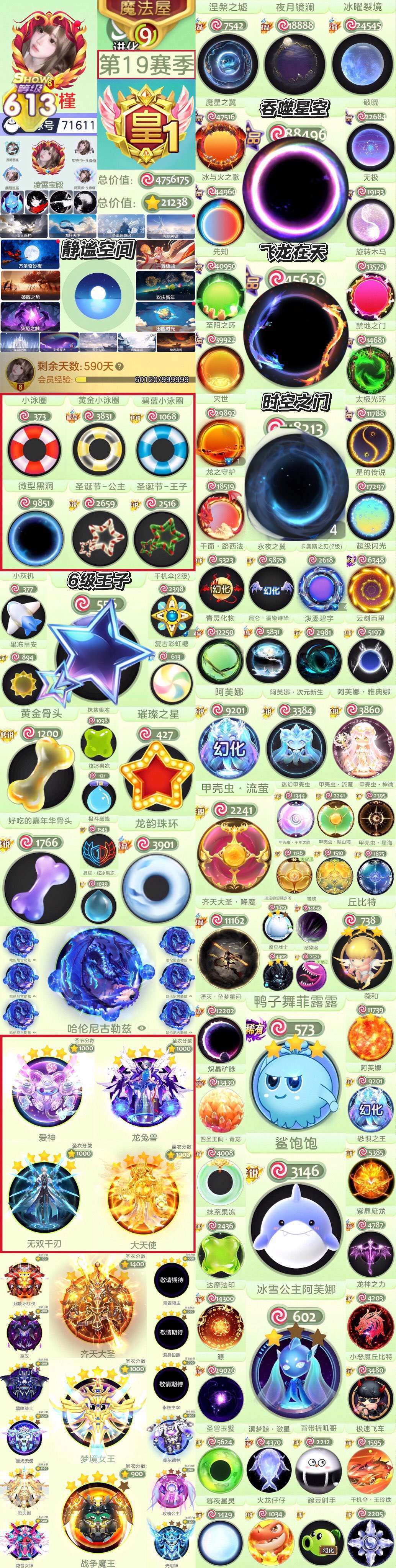 装备描述:秀等级613贵族等级皇第19赛季皮肤价值500万左右静谧空间带年卡会员带永久背景10多个飞龙在天吞噬星空时空之门魔星之翼冰火包子6级王子璀璨之星圣诞公主王子黄金骨头泳圈关键词鲨宝宝满级丘比特鸭子舞十字架甲壳虫漩涡阿福娜幻化阿福娜魔灵冰龙圣衣满级大天使爱神龙兔兽无双千刃梦境女王装满级魔王