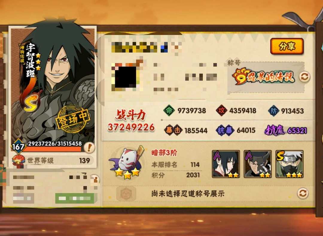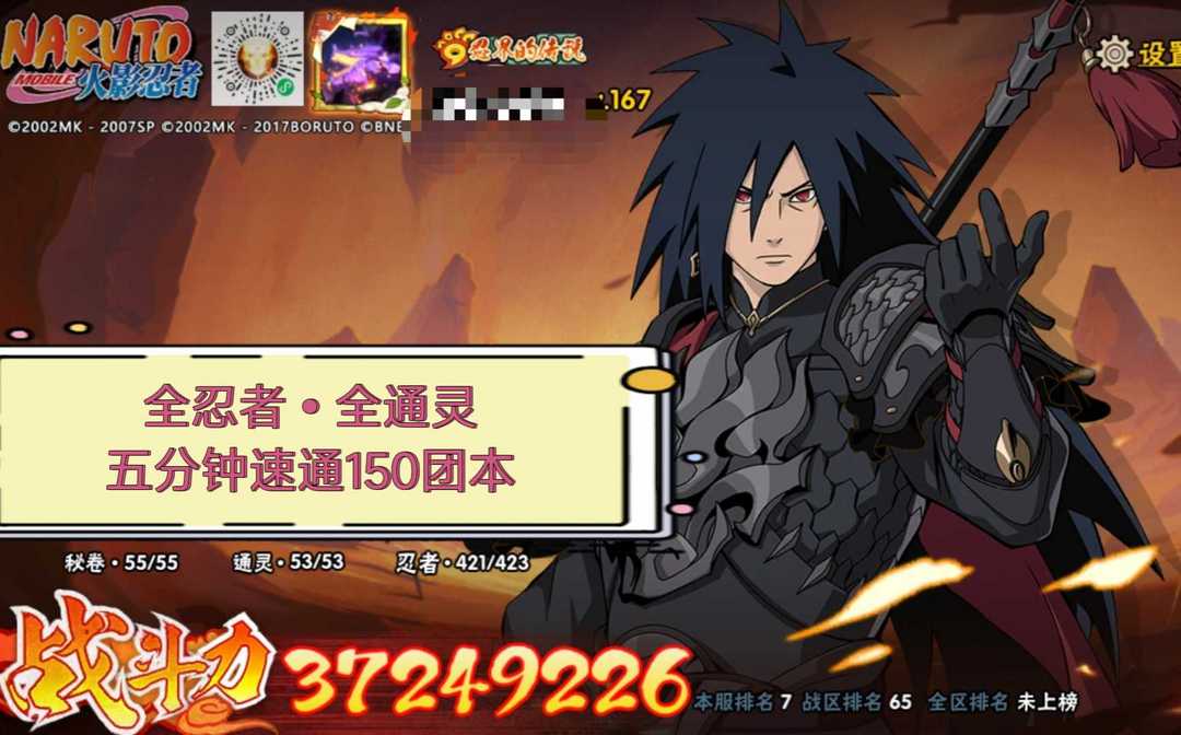 神驹斑+六道带土♓全忍者全通灵,3700W战力♋71级榜一魅力值✨超高属攻★五分钟速通150团本