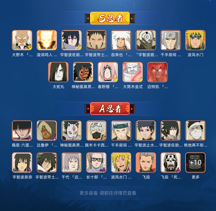 装备描述:13S 26A 141忍者 宇智波止水「新春限定」/桃地再不斩「漂泊武士」/佩恩·六道 「漂泊浪客」/波风水门「新春限定」/神秘面具男 「红夜之刃」/漩涡鸣人 「九喇嘛连结」/宇智波斑「白面具」/宇智波带土「忍界大战」/宇智波佐助 「永恒万花筒」