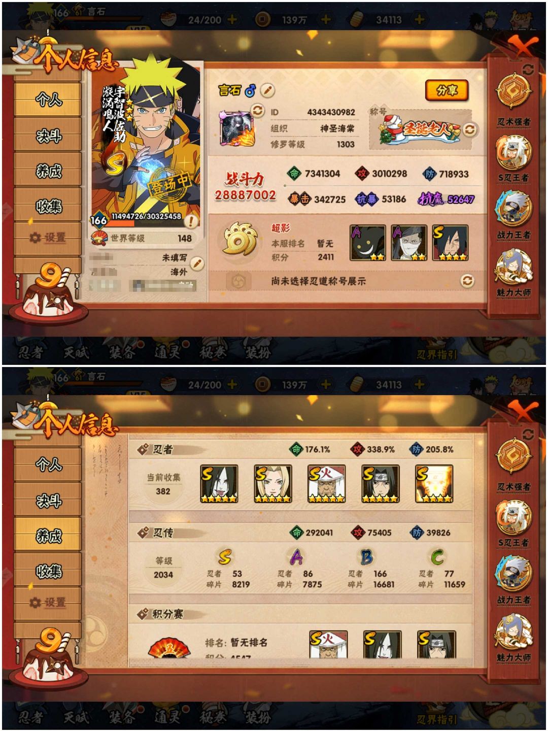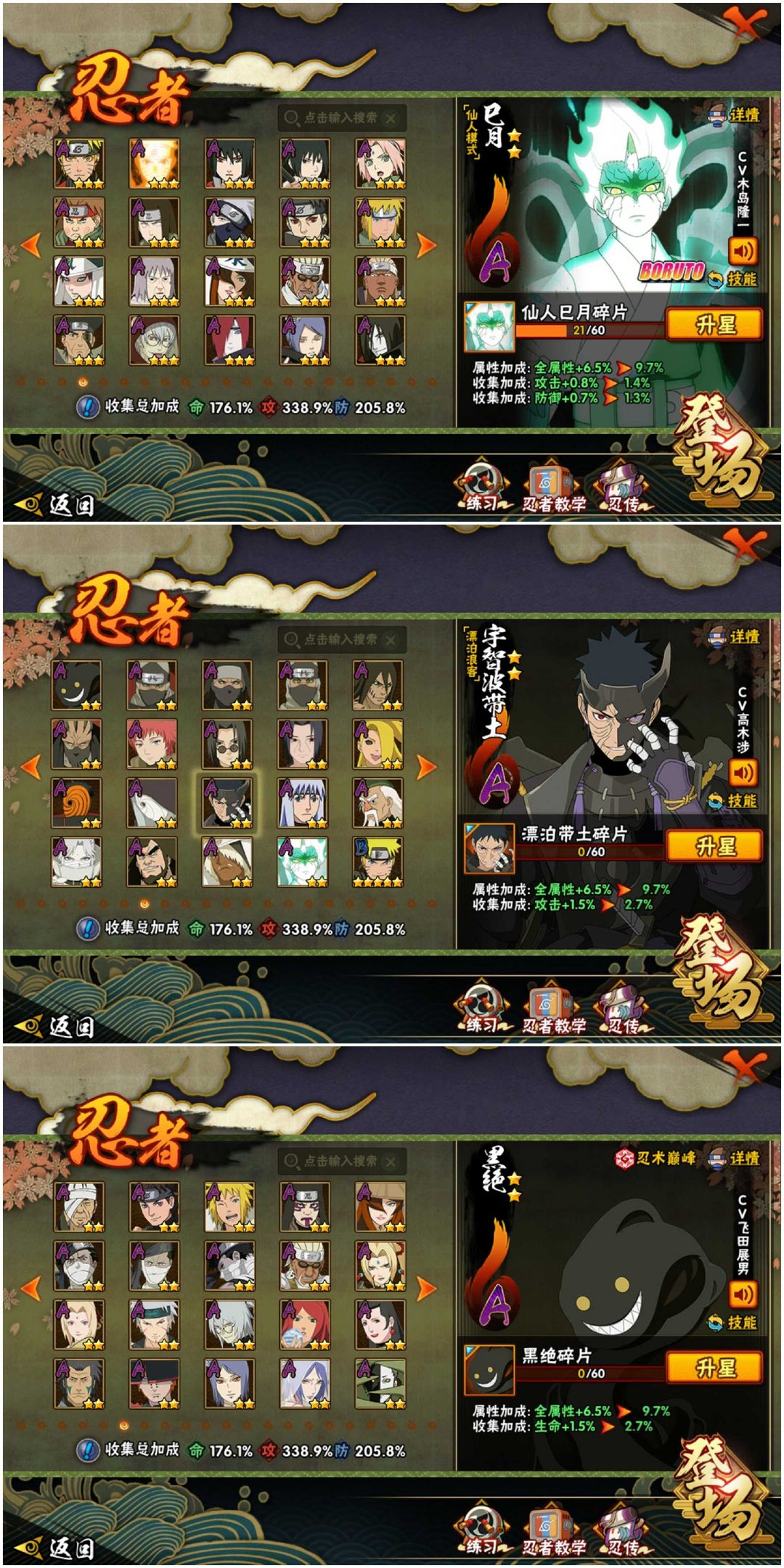 限制: 撤单率<40%才可租用此帐号装备描述:10传承奥义 S忍者:【大野木 「忍界大战」,漩涡鸣人 「九喇嘛连结」,千手柱间 「木叶创立」,大筒木舍人 「最终章」,宇智波佐助 「永恒万花筒」,宇智波斑 「木叶创立」,宇智波带土 「忍界大战」,千手柱间 「秽土转生」,大筒木桃式,罗砂 「四代目风影」,宇智波鼬 「秽土转生」,自来也 「舞之豪杰」,佩恩·天道 「超」,药师兜 「仙人模式」,宇智波斑 「秽土转生」,“宇智波斑” 「白面具」,半藏 「秽土转生」,千手扉间 「秽土转生」,纲手 「百豪」,无 「二代目土影」,宇智波斑 「五影会谈」,漩涡鸣人 「暴怒·第六尾」,烈斗 「初代目风影」,宇智波止水 「须佐能乎」,艾 「忍界大战」,自来也 「传说中的三忍」,艾 「四代目雷影」,波风水门,波风水门 「秽土转生」,大蛇丸,大野木 「三代目土影」,纲手,鬼灯幻月 「二代目水影」,金角银角 「秽土转生」,佩恩 「天道」,千手扉间,千手柱间,神秘面具男,自来也 「仙人模式」,宇智波斑,宇智波鼬 「须佐能乎」,猿飞日斩,猿飞日斩 「秽土转生」,长门 「秽土转生」自来也,神秘面具男 「红夜之刃」,宇智波斑 「秽土转生·解」,春野樱 「忍界大战」