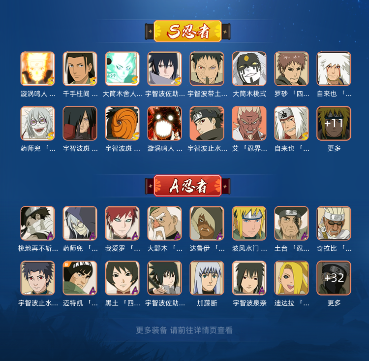 忍者比较丰富,氪金通灵有三个,忍战带土,五影会谈带土,漂泊带土,侠隐江湖药师兜