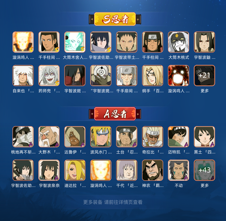 装备描述:38s✨五影会谈斑✨漂泊带土✨暴怒六尾✨舍人✨创立柱间✨金身水门✨须佐止水✨大筒木桃式✨双s雷影✨须佐卡卡西✨鸡翅佐助等众多s忍者和A忍。