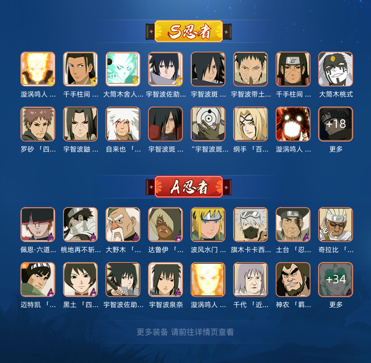 装备描述:35个s忍,50个a忍,漂泊带土,小南,佩恩 秽土鼬到金身水门的高招都有