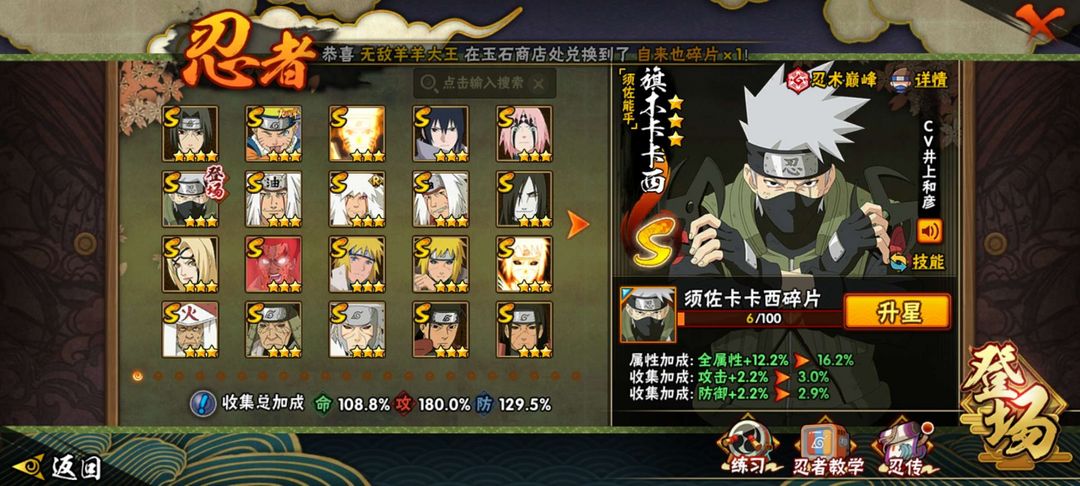 装备描述:32S.十尾人柱力带土,十周年鸣佐✨神驹佑将小南,须佐卡卡西,九喇叭水门,红月男,须佐止水,面麻,仙人巳月✨解斑✨