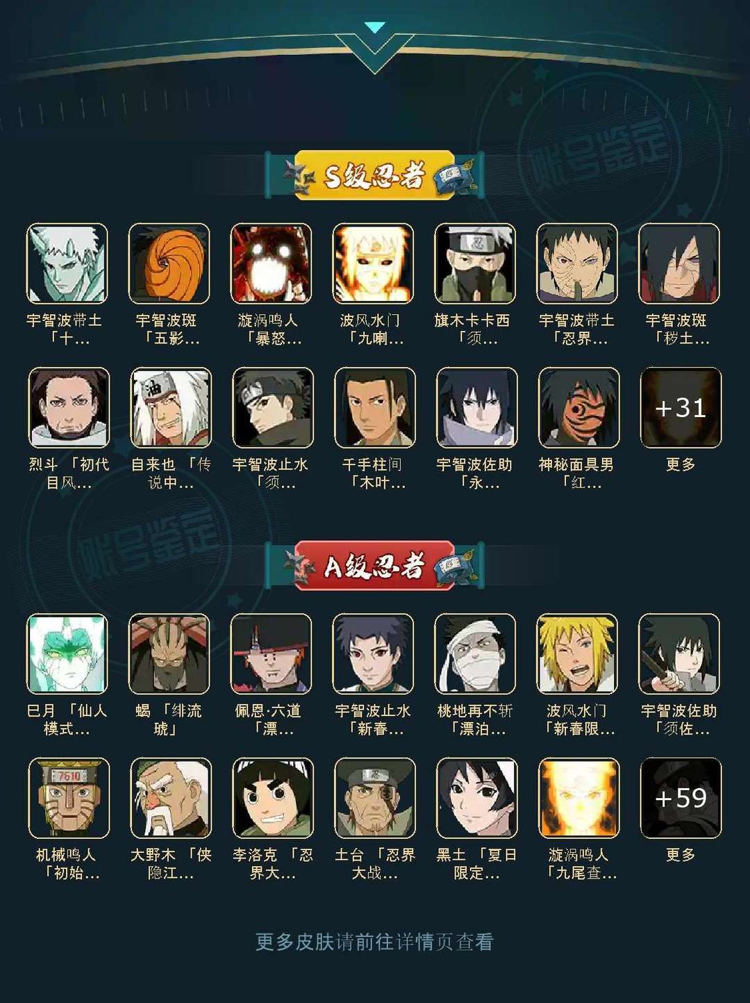装备描述:44S 72A 324忍者 宇智波止水「新春限定」/桃地再不斩「漂泊武士」/蝎 「绯流琥」/佩恩·六道 「漂泊浪客」/波风水门「新春限定」/巳月 「仙人模式」/烈斗 「初代目风影」/神秘面具男 「红夜之刃」/宇智波斑 「秽土转生·解」/自来也 「传说中的三忍」/宇智波带土 「十尾人柱力」/波风水门「秽土转生」/千手柱间 「木叶创立」/宇智波止水 「须佐能乎」/漩涡鸣人 「九喇嘛连结」/漩涡鸣人 「暴怒·第六尾」/宇智波斑 「五影会谈」/宇智波斑「白面具」/宇智波带土「忍界大战」/三代目风影 「秽土转生」/宇智波佐助 「永恒万花筒」/佩恩·天道「超」/旗木卡卡西 「须佐能乎」/波风水门 「九喇嘛连结」