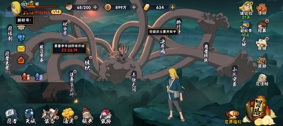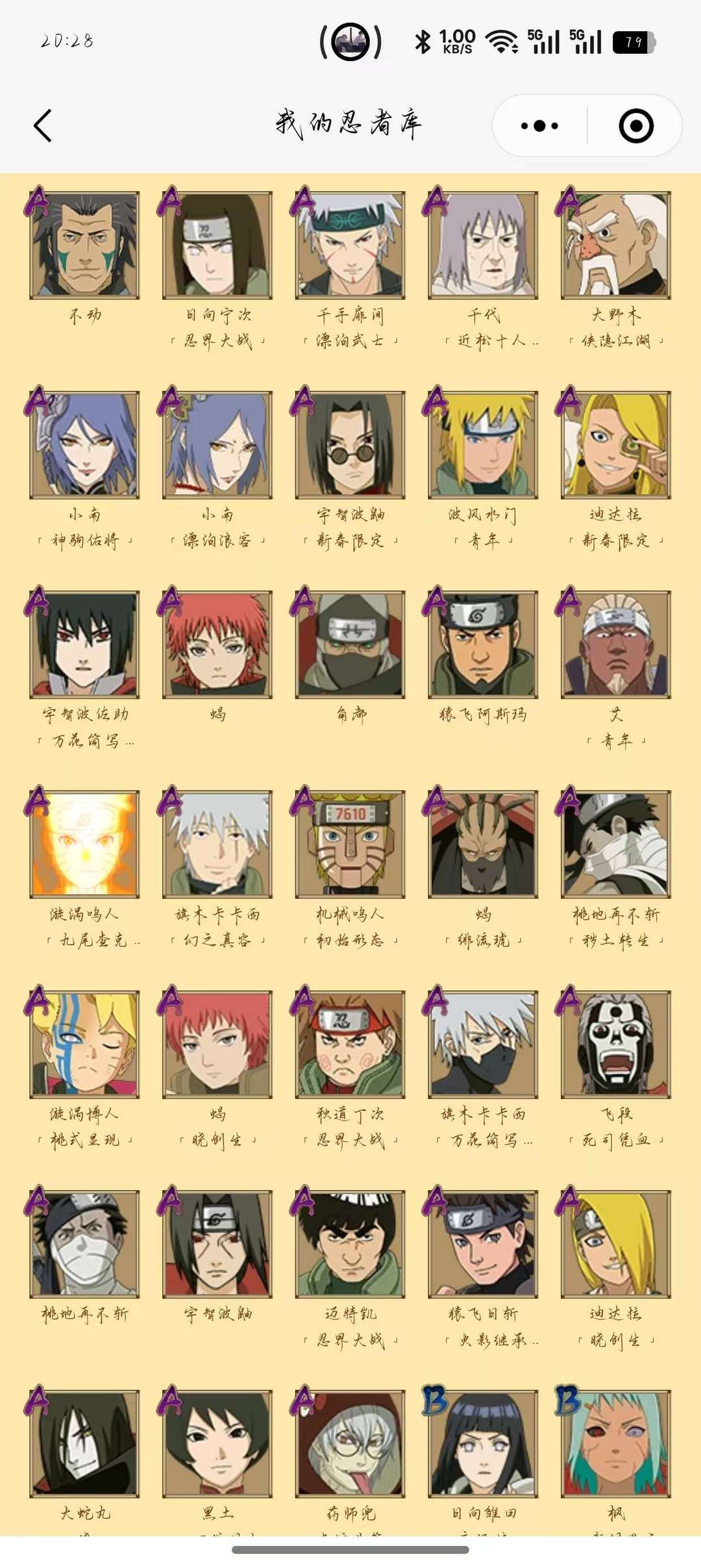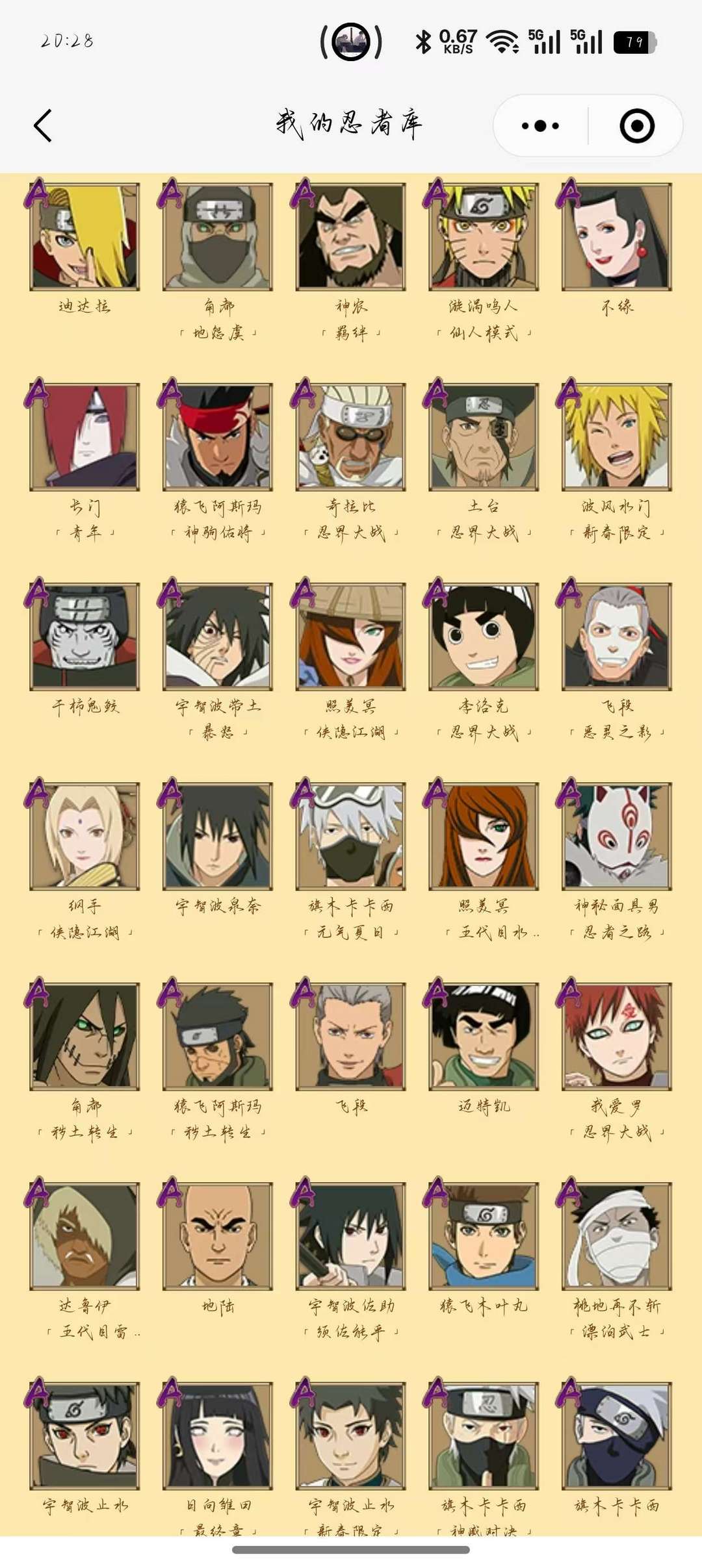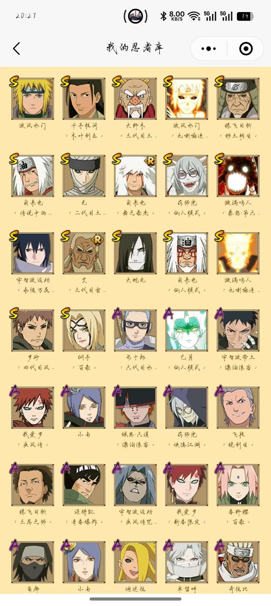 装备描述:三忍之师,晓创生蝎,青春哥,熊猫,8个忍法帖忍者一共346个忍者,九尾鸣人,永恒佐助,小樱,漂泊侠隐系列忍者