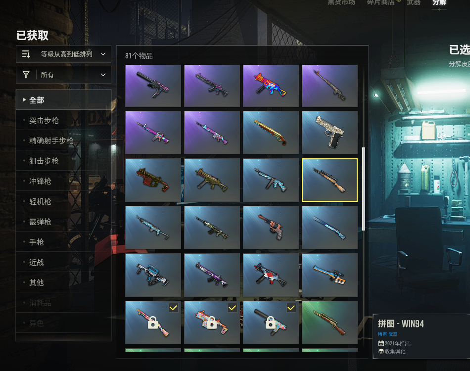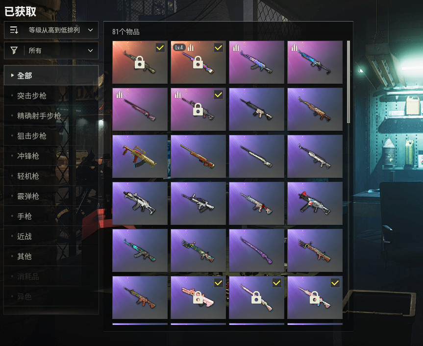 ④级妖魔之触ACE✅暗影缠身AKM✅湮灭M762✅雪国风光M4✅彩虹蛋糕莫辛纳甘✅湮灭M24✅幸运骑