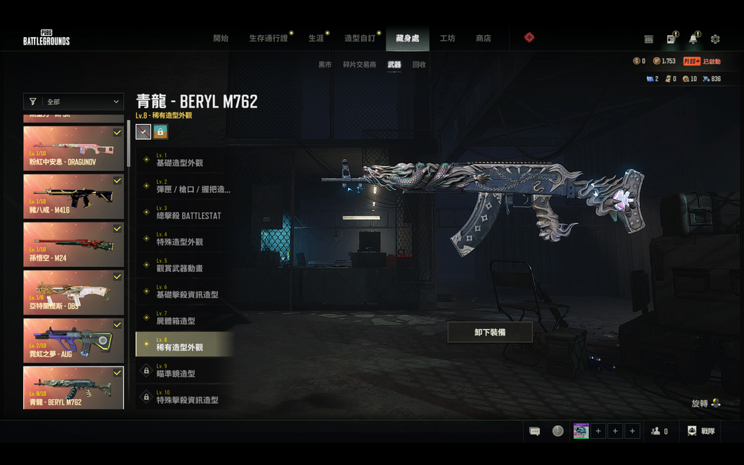 8级青龙M762✅阿斯顿马丁✅黄金杜卡迪✅✅7成长武器+彩色烟雾弹✅绿头悲喜柏林战神衣拉风龙夹克老黑